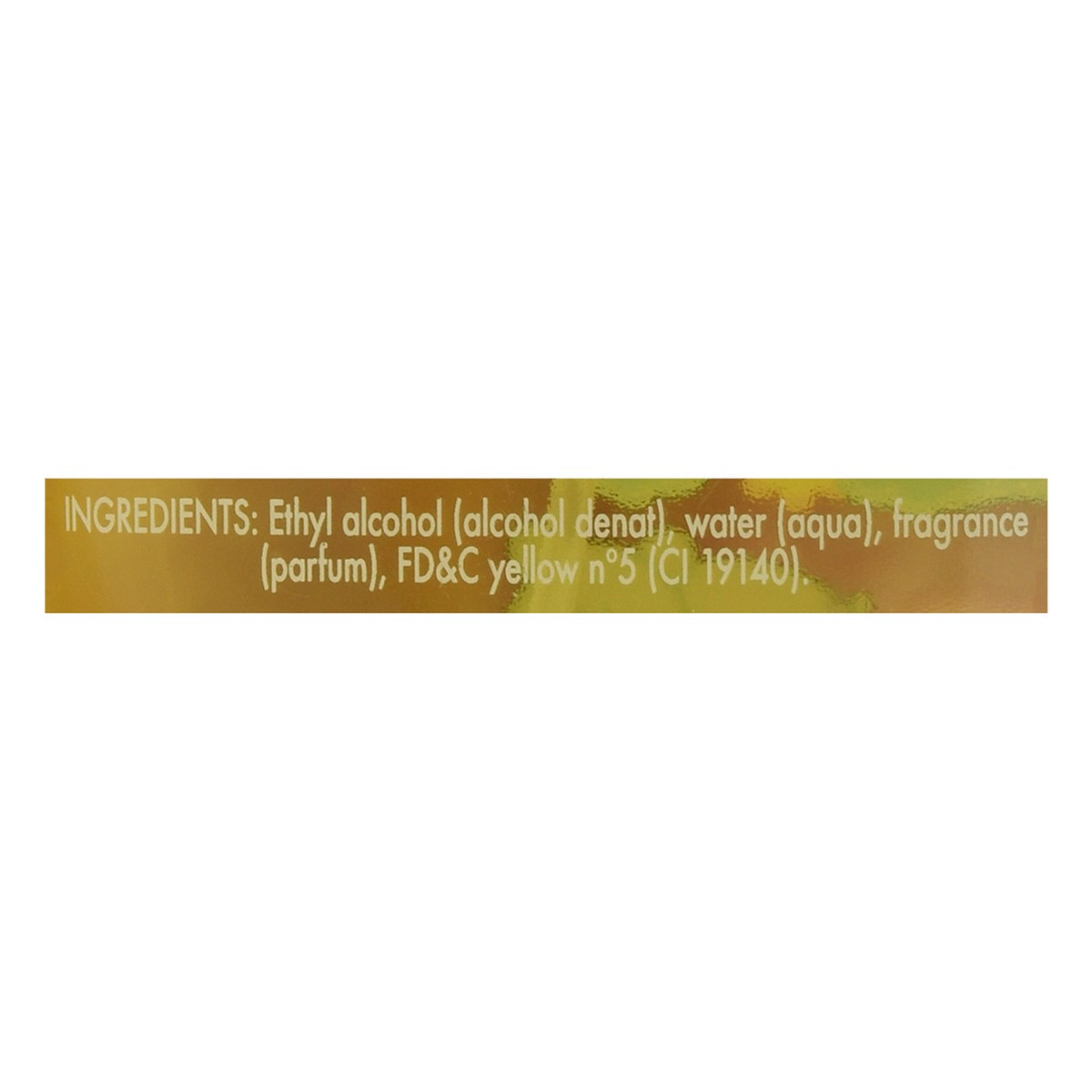 Ethyl Alcohol (Alcohol Denat), Water (Aqua), Fragrance (Parfum), FD&C Yellow No.5 (CI 19140).