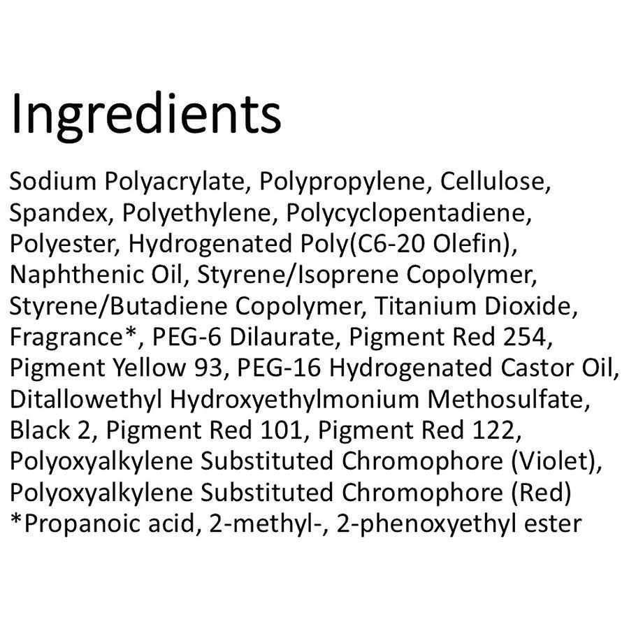 Sodium Polyacrylate, Polypropylene, Cellulose, Spandex, Polyethylene, Polycyclopentadiene, Polyester, Hydrogenated Poly(C6-20 Olefin), Naphthenic Oil, Styrene/Isoprene Copolymer, Styrene/Butadiene Cop…
