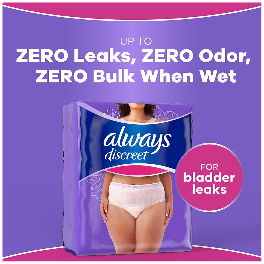 Try Always Discreet incontinence underwear for women. These reimagined adult diapers for women have up to zero leaks, zero odor, and zero bulk when wet for incontinence protection you can depend on. D…