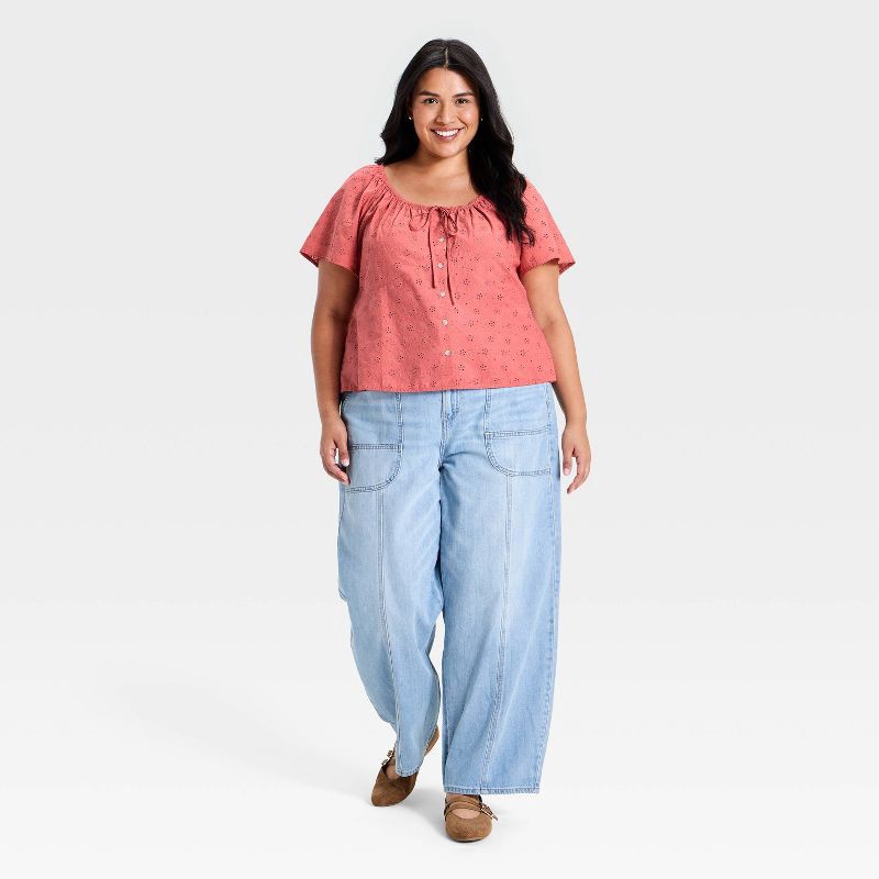 From brunches to travel, this Short-Sleeve Eyelet Scoop Neck Blouse from Universal Thread™ will be your new go-to pick. Made of 100% cotton, this short-sleeve blouse keeps you cool and comfy. It featu…