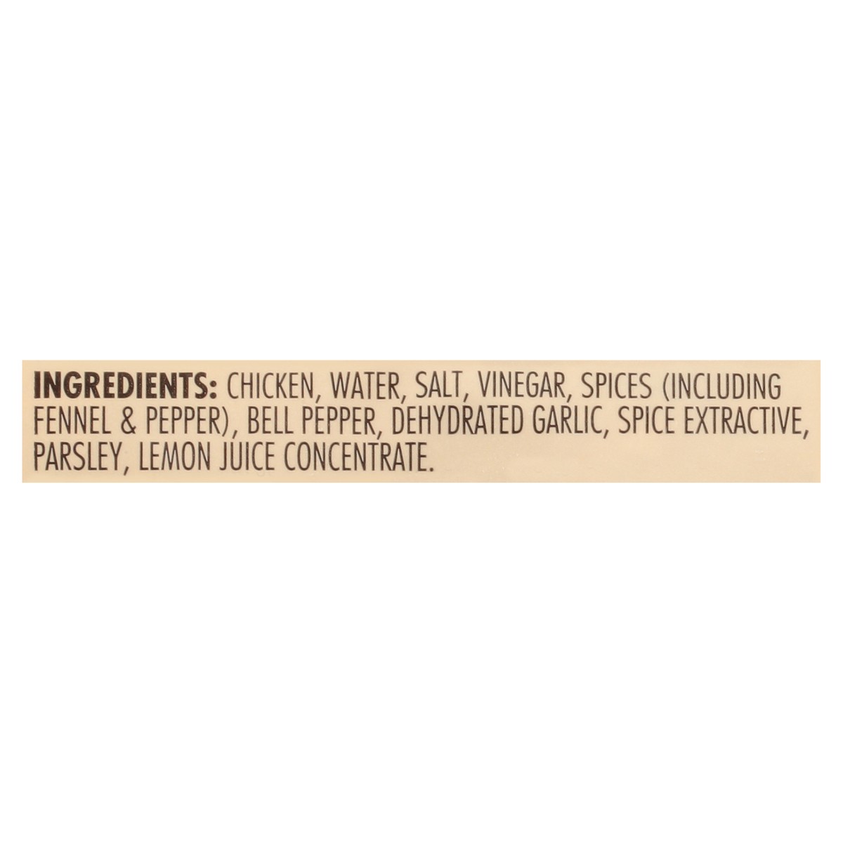 Chicken, Water, Salt, Vinegar, Spices (Including Fennel & Pepper), Bell Pepper, Dehydrated Garlic, Spice Extractive, Parsley, Lemon Juice Concentrate.
