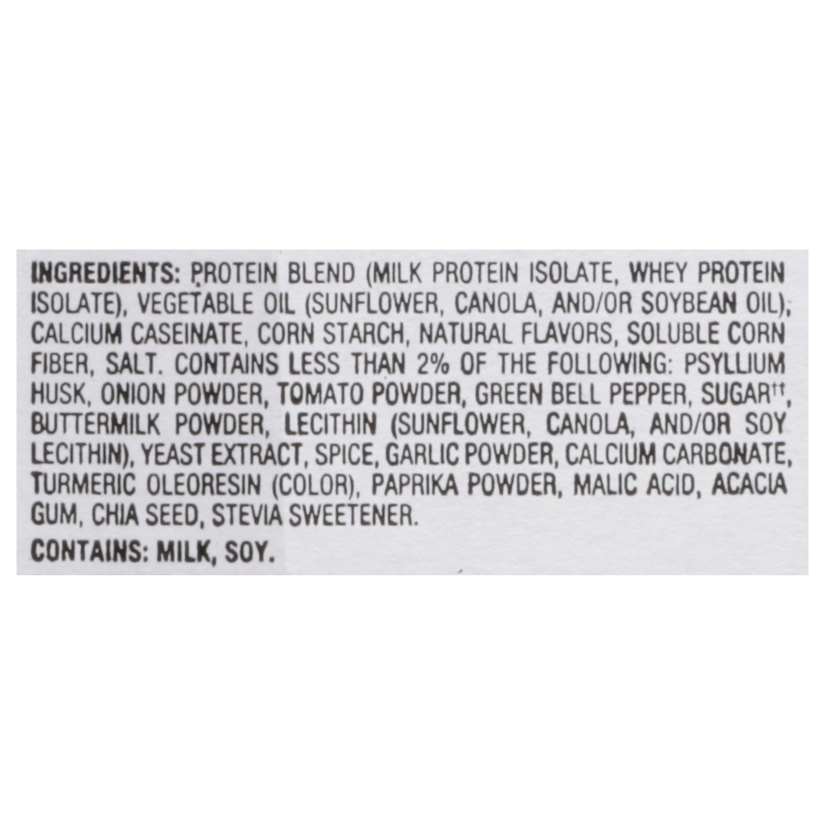 Protein Blend (Milk Protein Isolate, Whey Protein Isolate), Vegetable Oil (Sunflower, Canola, and/or Soybean Oil), Calcium Caseinate, Corn Starch, Natural Flavors, Soluble Corn Fiber, Salt, Contains L…