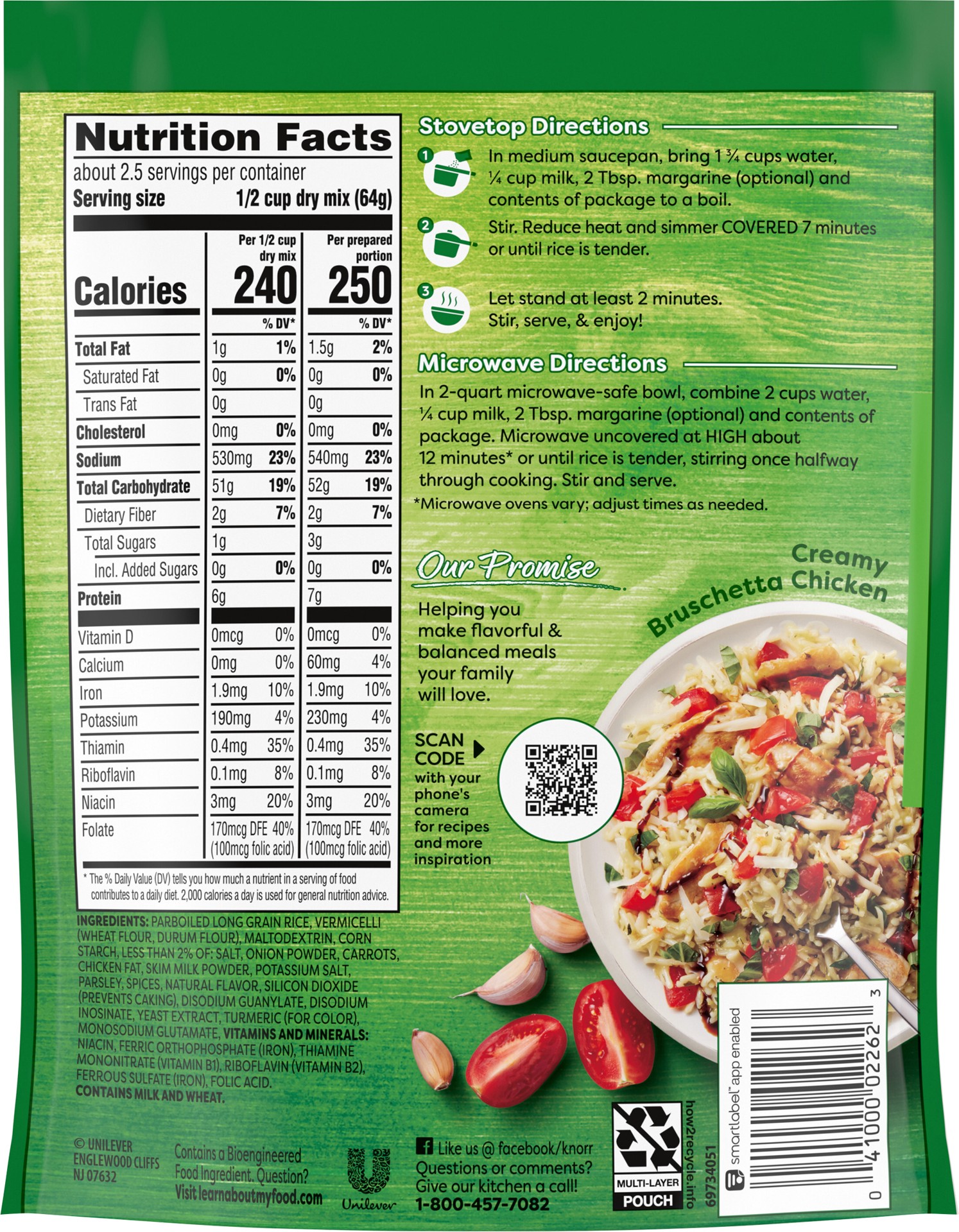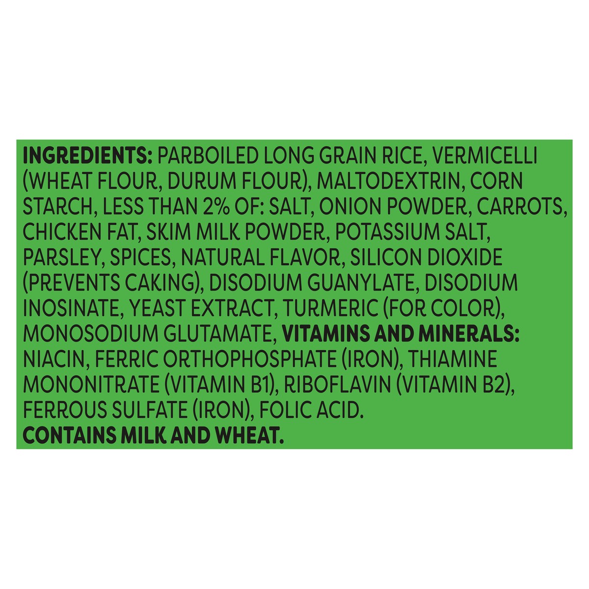 Parboiled Long Grain Rice, Vermicelli (Wheat Flour, Durum Flour), Maltodextrin, Corn Starch, Less than 2% of: Salt, Onion Powder, Carrots, Chicken Fat, Skim Milk Powder, Potassium Salt, Parsley, Spice…