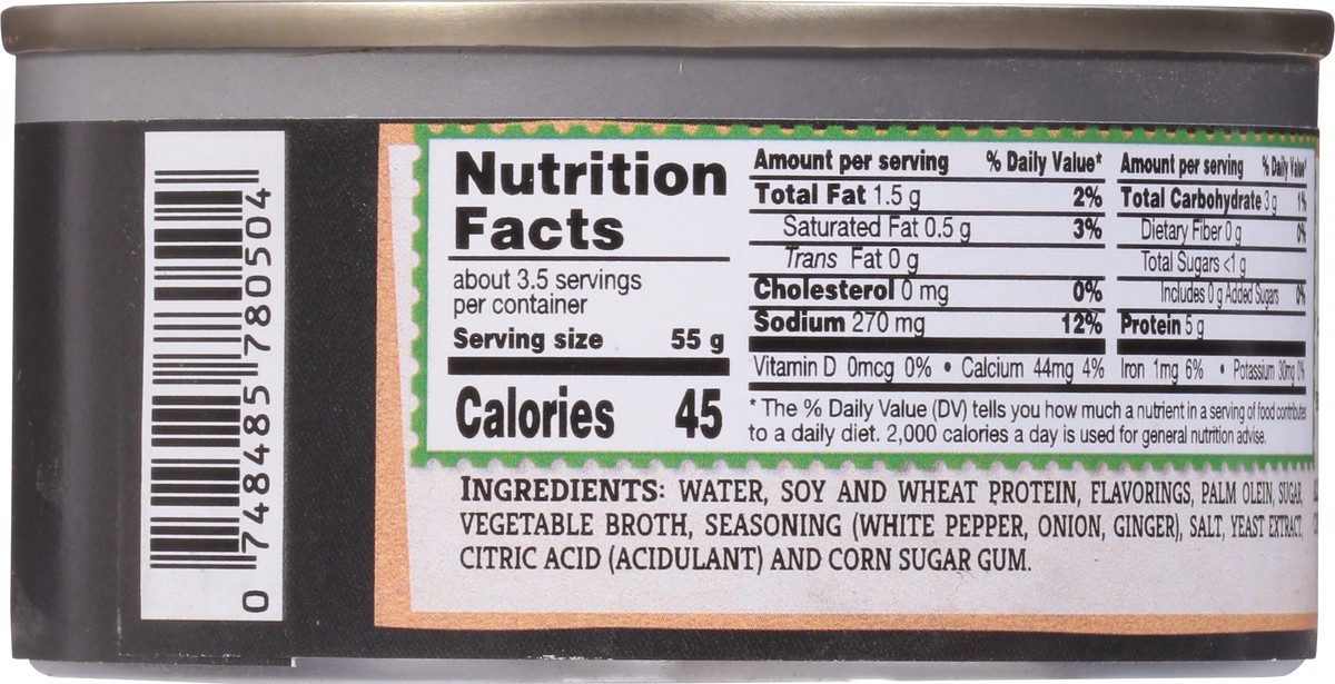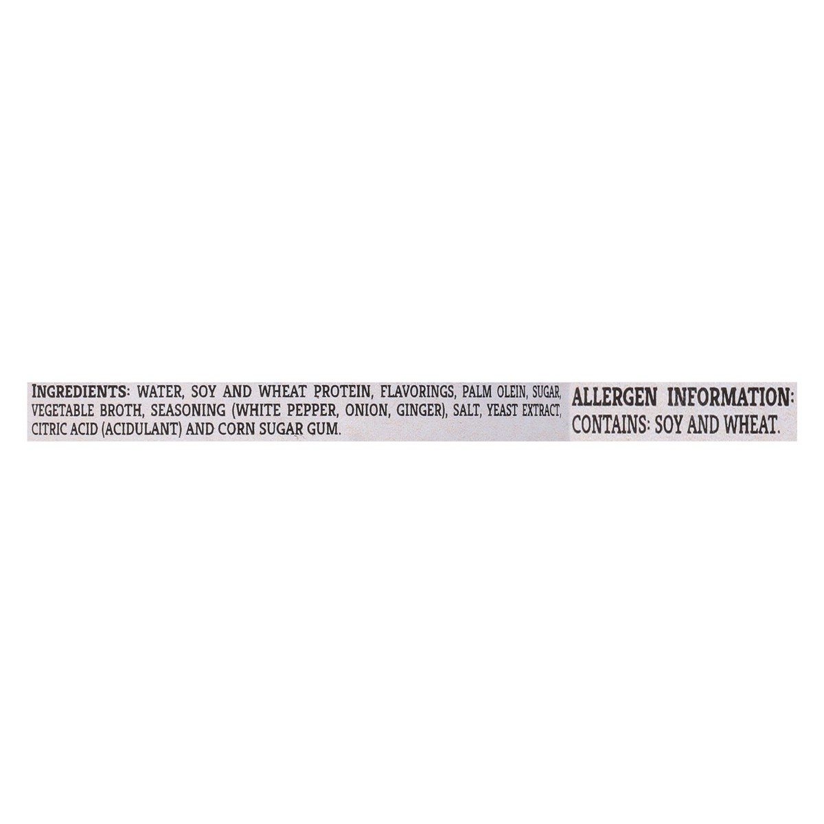 Water, Soy and Wheat Protein, Flavorings, Palm Olein, Sugar, Vegetable Broth, Seasoning (White Pepper, Onion, Ginger), Salt, Yeast Extract, Citric Acid (Acidulant) and Corn Sugar Gum.