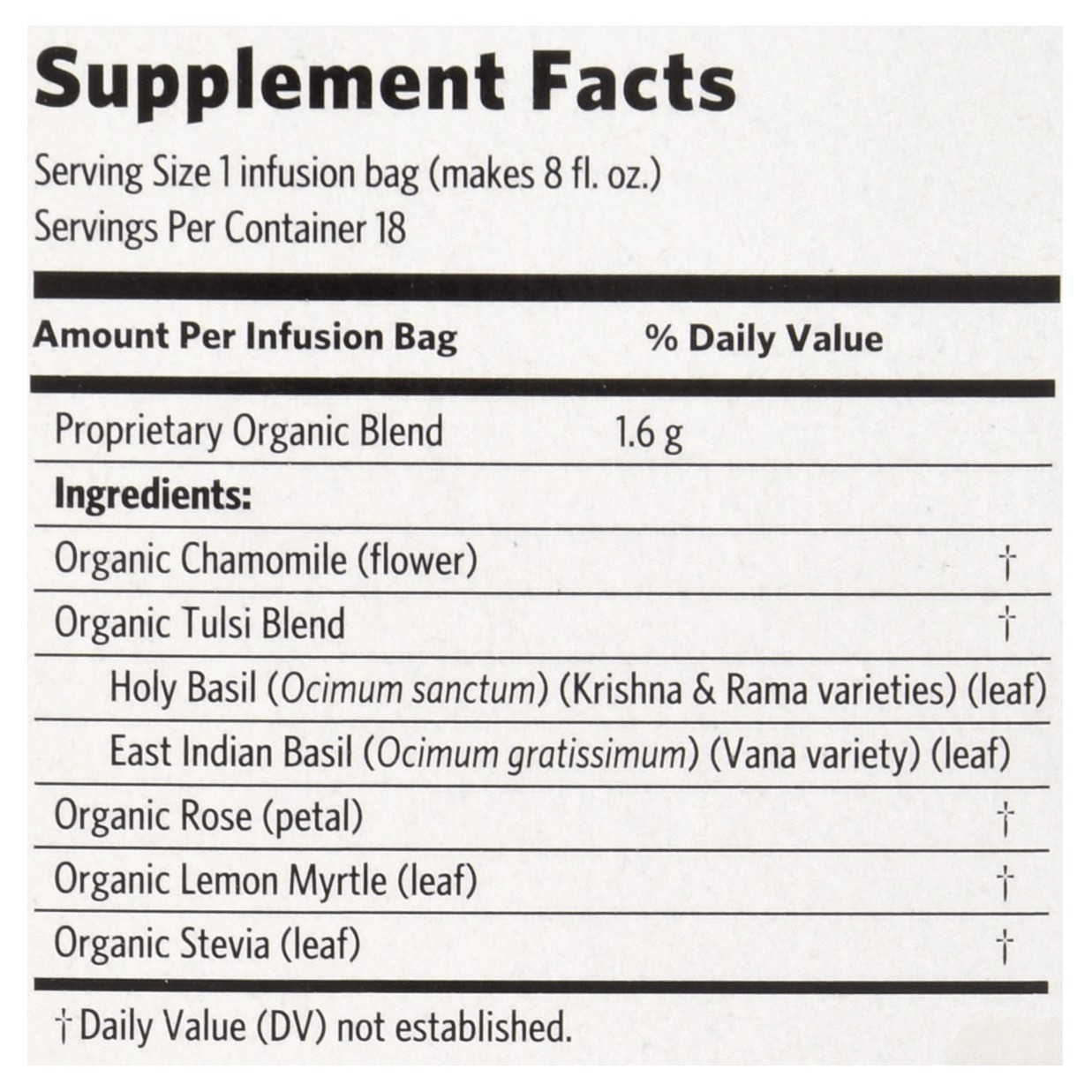 Proprietary Organic Blend: Organic Chamomile (Flower), Organic Tulsi Blend: Holy Basil (Ocimum Sanctum) (Krishna & Rama Varieties) (Leaf), East Indian Basil (Ocimum Gratissimum) (Vana Variety) (Leaf)]…