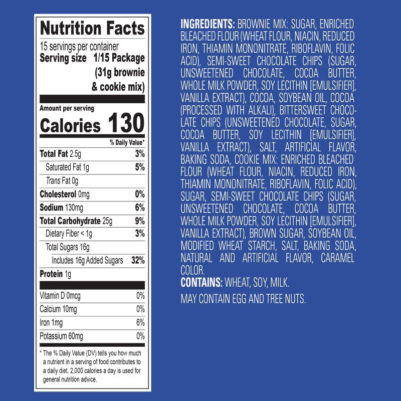 Brownie Mix: Sugar, Enriched Bleached Flour (Wheat Flour, Niacin, Reduced Iron, Thiamin Mononitrate, Riboflavin, Folic Acid), Semi-Sweet Chocolate Chips (Sugar, Unsweetened Chocolate, Cocoa Butter, Wh…