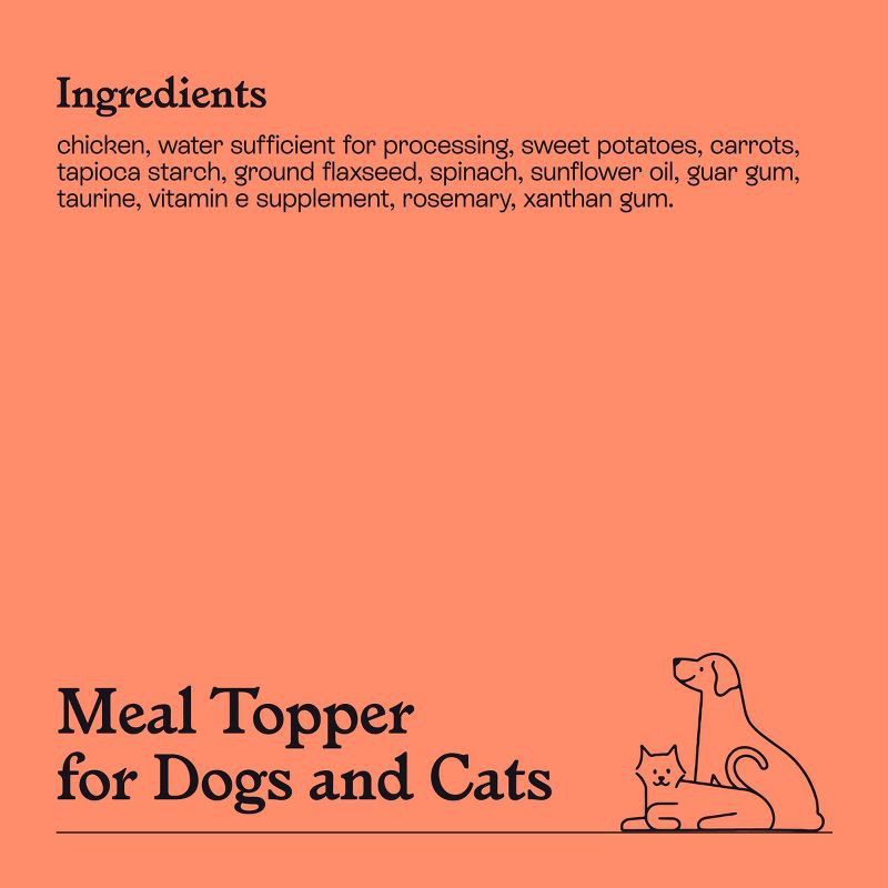 CHICKEN, WATER SUFFICIENT FOR PROCESSING, SWEET POTATOES, CARROTS, TAPIOCA STARCH, GROUND FLAXSEED, SPINACH, SUNFLOWER OIL, GUAR GUM, TAURINE, VITAMIN E SUPPLEMENT, ROSEMARY, XANTHAN GUM.