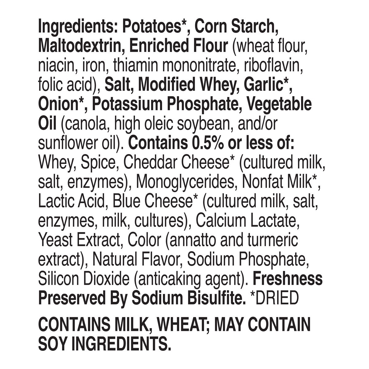 Potatoes*, Corn Starch, Maltodextrin, Enriched Flour (Wheat Flour, Niacin, Iron, Thiamin Mononitrate, Riboflavin, Folic Acid), Salt, Modified Whey, Garlic*, Onion*, Potassium Phosphate, Vegetable Oil …