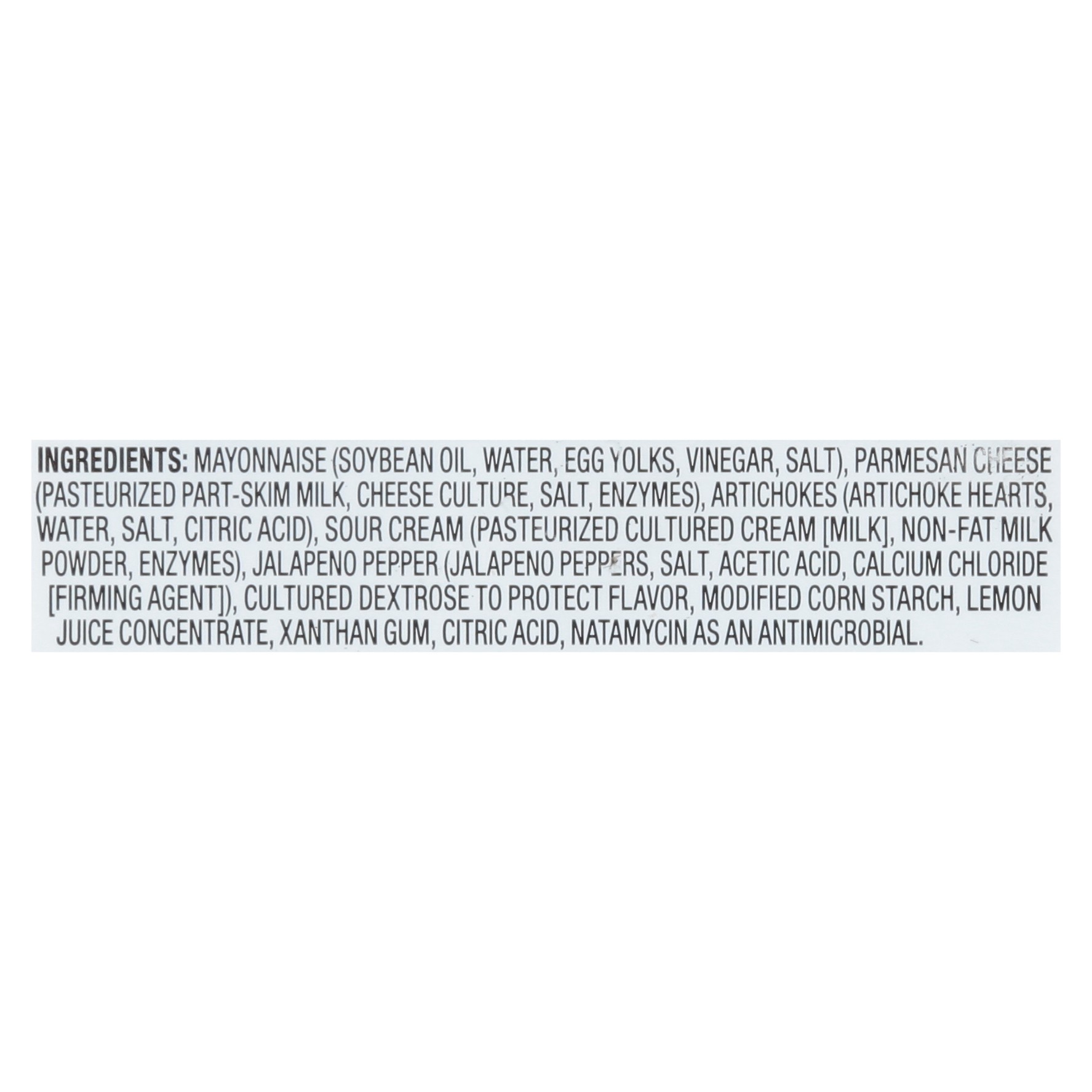 Mayonnaise (Soybean Oil, Water, Egg Yolks, Vinegar, Salt), Parmesan Cheese (Pasteurized Part-Skim Milk, Cheese Culture, Salt, Enzymes), Artichokes (Artichoke Hearts, Water, Salt, Citric Acid), Sour Cr…