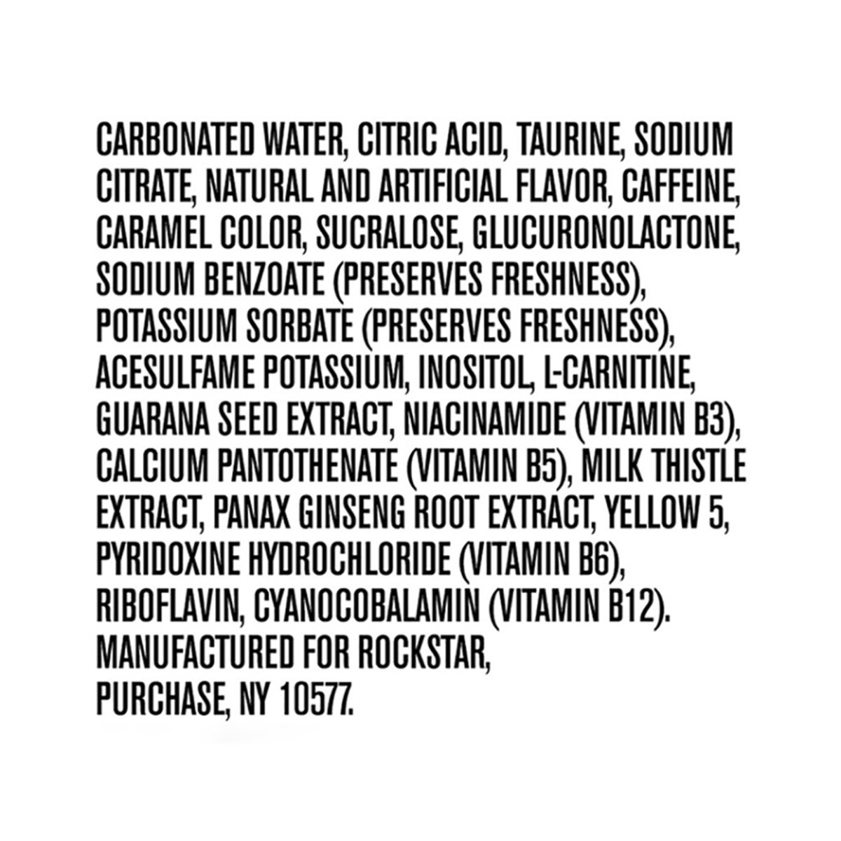 Carbonated Water, Citric Acid, Taurine, Sodium Citrate, Natural and Artificial Flavor, Caffeine, Caramel Color, Sucralose, Glucuronolactone, Sodium Benzoate (Preserves Freshness), Potassium Sorbate (P…