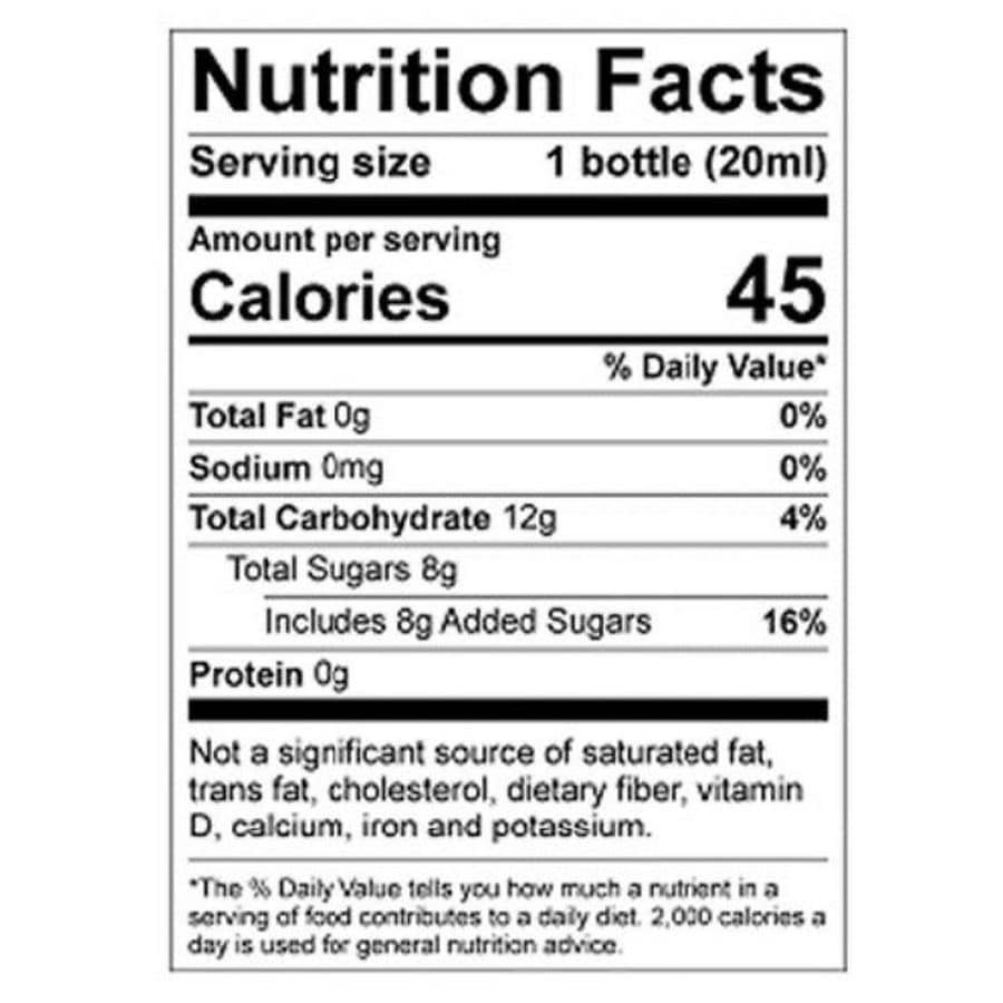 Water, Sugar, Citric Acid, Glycerin, Malic Acid, Lactic Acid, Artificial Flavors, Potassium Sorbate Preservative, Blue 1, Yellow 5.