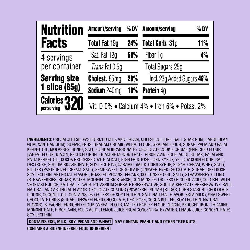 CREAM CHEESE (PASTEURIZED MILK AND CREAM, CHEESE CULTURE, SALT, GUAR GUM, CAROB BEAN GUM, XANTHAN GUM), SUGAR, EGGS, GRAHAM CRUMB (WHEAT FLOUR, GRAHAM FLOUR, SUGAR, PALM AND PALM KERNEL OIL, MOLASSES,…