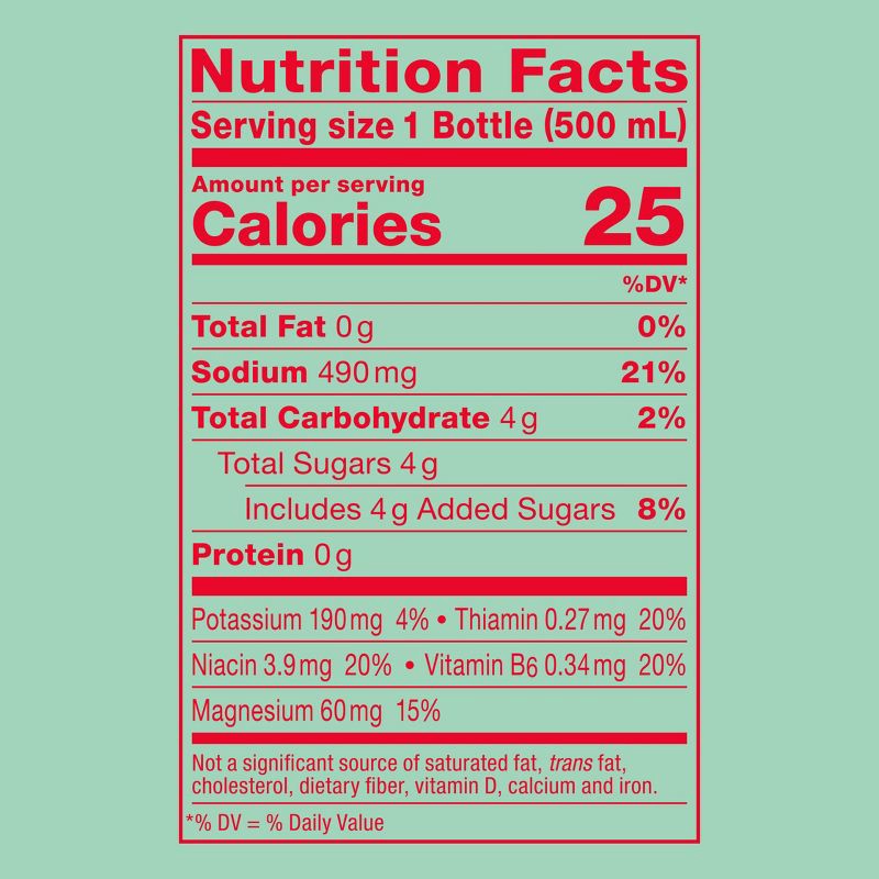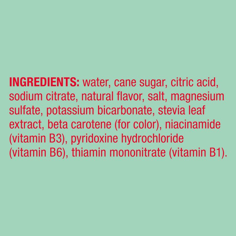 Water, Cane Sugar, Citric Acid, Sodium Citrate, Natural Flavor, Salt, Magnesium Sulfate, Potassium Bicarbonate, Stevia Leaf Extract, Beta Carotene (for Color), Niacinamide (Vitamin B3), Pyridoxine Hyd…
