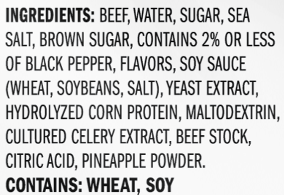 Beef, Water, Sugar, Sea Salt, Brown Sugar, Contains 2% or Less of Black Pepper, Flavors, Soy Sauce (Wheat, Soybeans, Salt), Yeast Extract, Hydrolyzed Corn Protein, Maltodextrin, Cultured Celery Extrac…