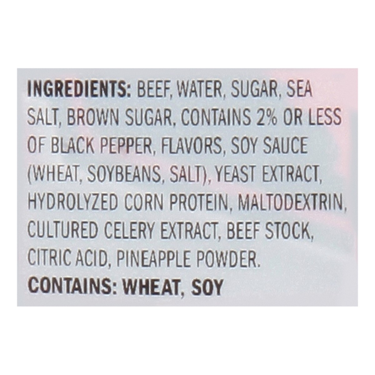 Beef, Water, Sugar, Sea Salt, Brown Sugar, Contains 2% or Less of Black Pepper, Flavors, Soy Sauce (Wheat, Soybeans, Salt), Yeast Extract, Hydrolyzed Corn Protein, Maltodextrin, Cultured Celery Extrac…