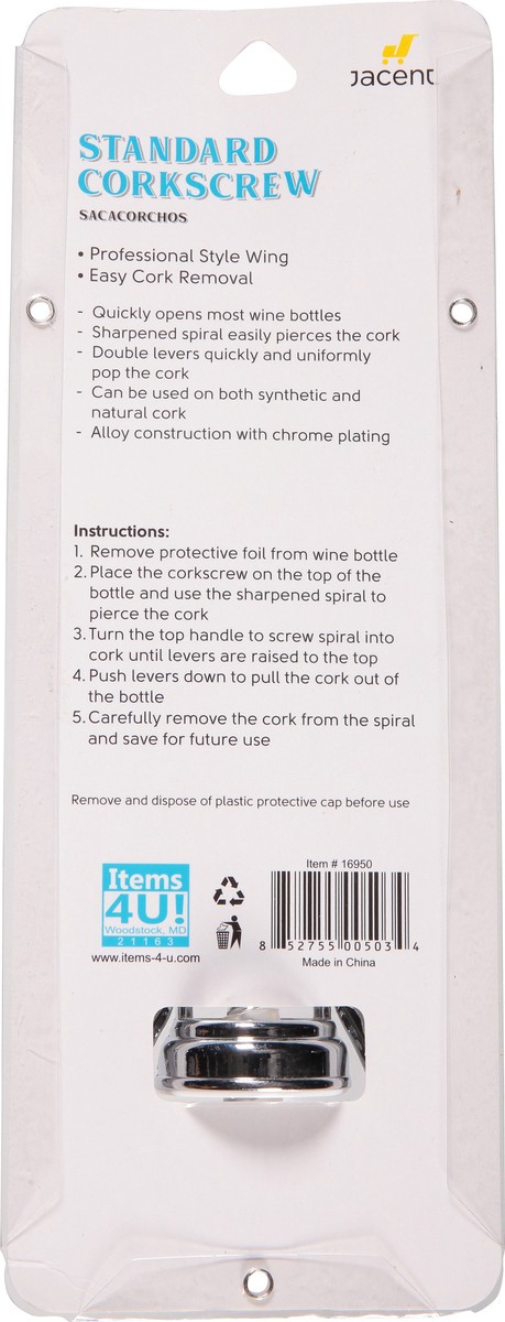 Professional style wing. Easy cork removal. Quickly opens most wine bottles. Sharpened spiral easily pierces the cork. Double levers quickly and uniformly pop the cork. Can be used on both synthetic a…