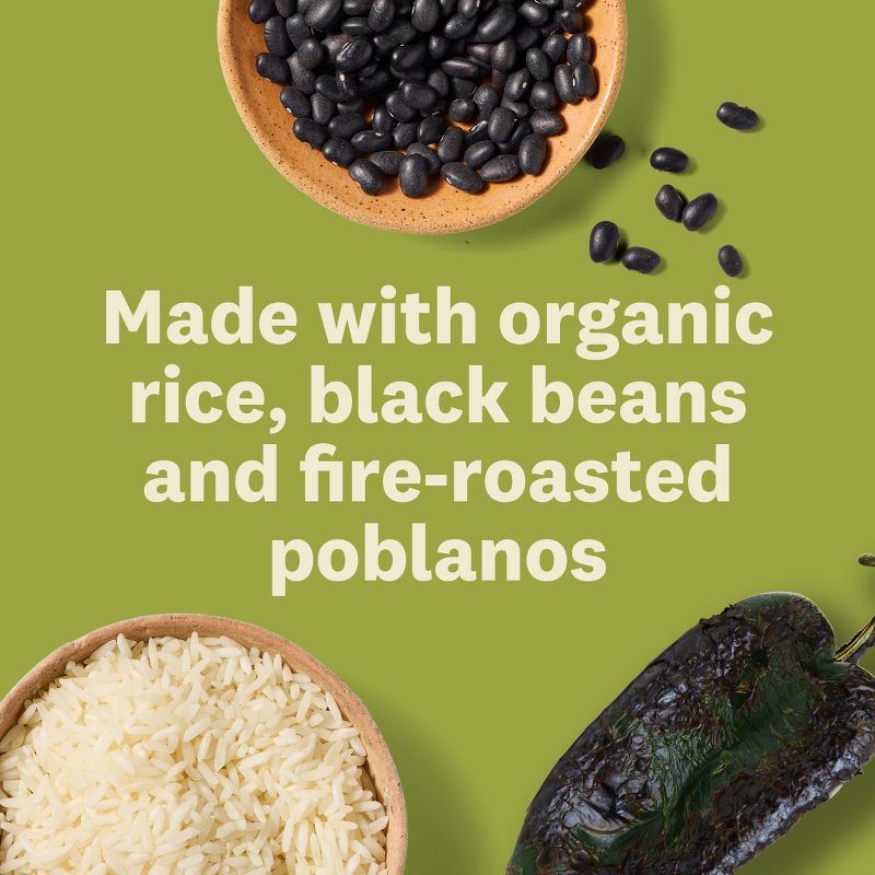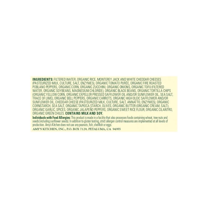 Filtered Water, Organic Rice, Monterey Jack and White Cheddar Cheeses (Pasteurized Milk, Culture, Salt, Enzymes), Organic Tomato Puree, Organic Fire Roasted Poblano Peppers, Organic Corn, Organic Zucc…