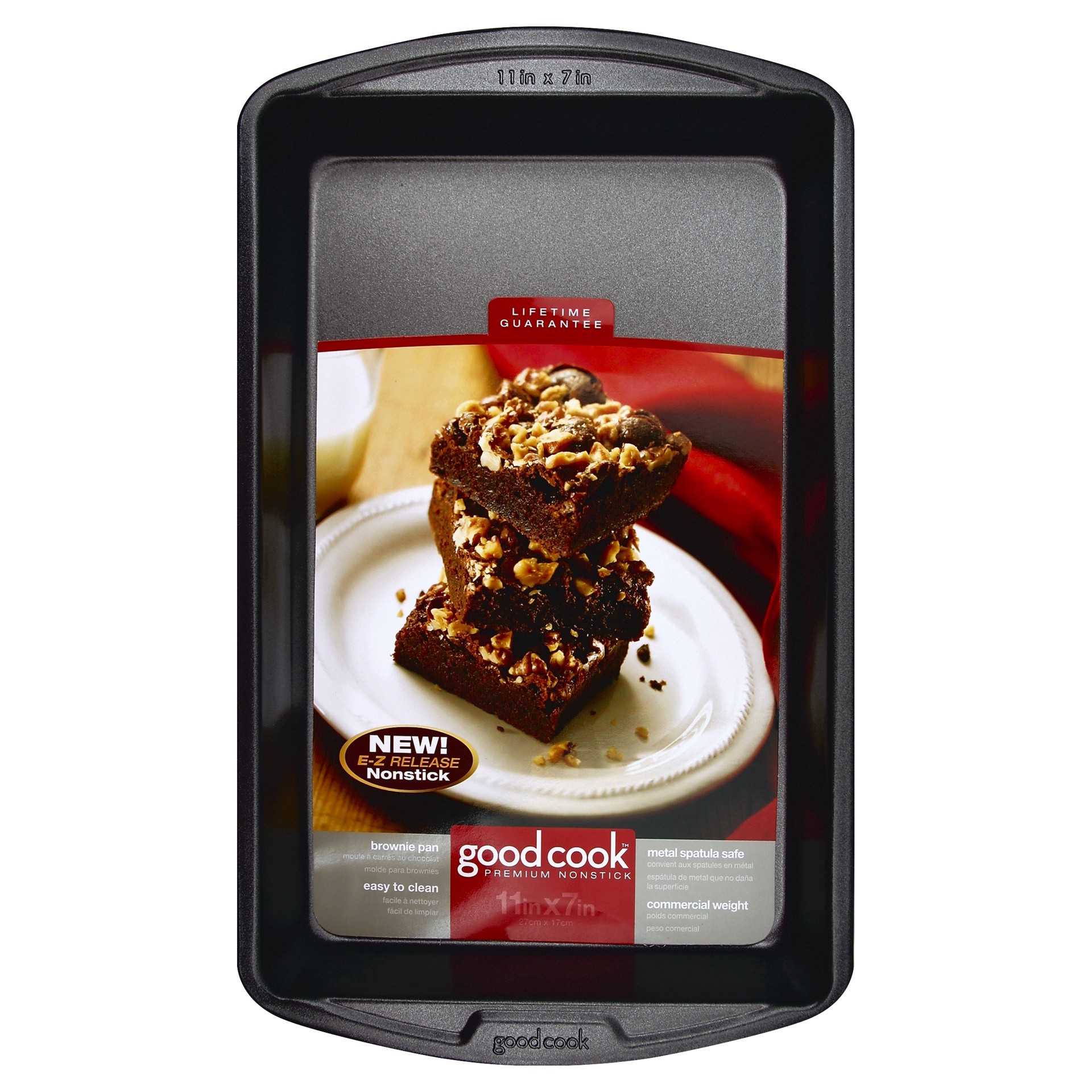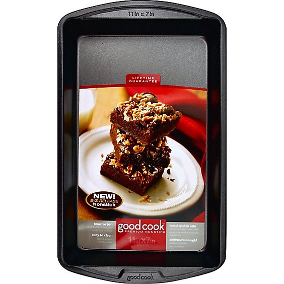 11 in x 7 in. Premium nonstick. E-Z release nonstick. Easy to clean. Metal spatula safe. Commercial weight. Lifetime guarantee. Made in Indonesia.