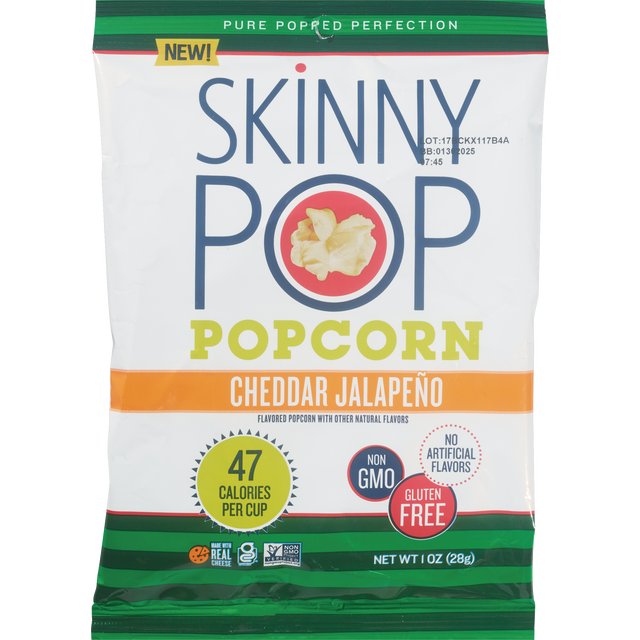 new! pure popped perfection skiÌnny pop popcorn cheddar jalapeño flavored popcorn with other natural flavors 47 calories per cup made with real cheese