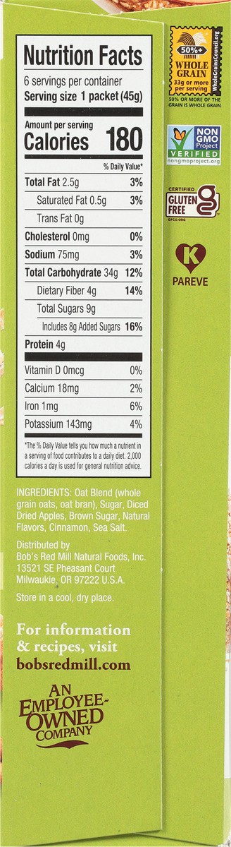 Bob's Red Mill Whole Grain Apple & Cinnamon Instant Oatmeal 6 - 1.59 oz Packets