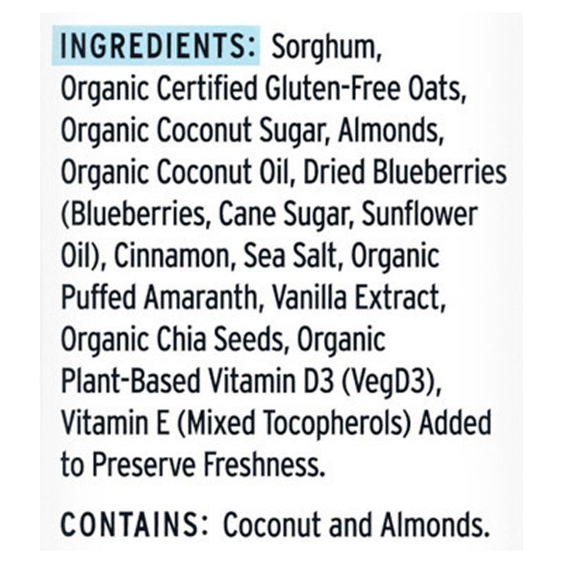 Sorghum, Organic Certified Gluten-Free Oats, Organic Coconut Sugar, Almonds, Organic Coconut Oil, Dried Blueberries (Blueberries, Cane Sugar, Sunflower Oil), Cinnamon, Sea Salt, Organic Puffed Amarant…