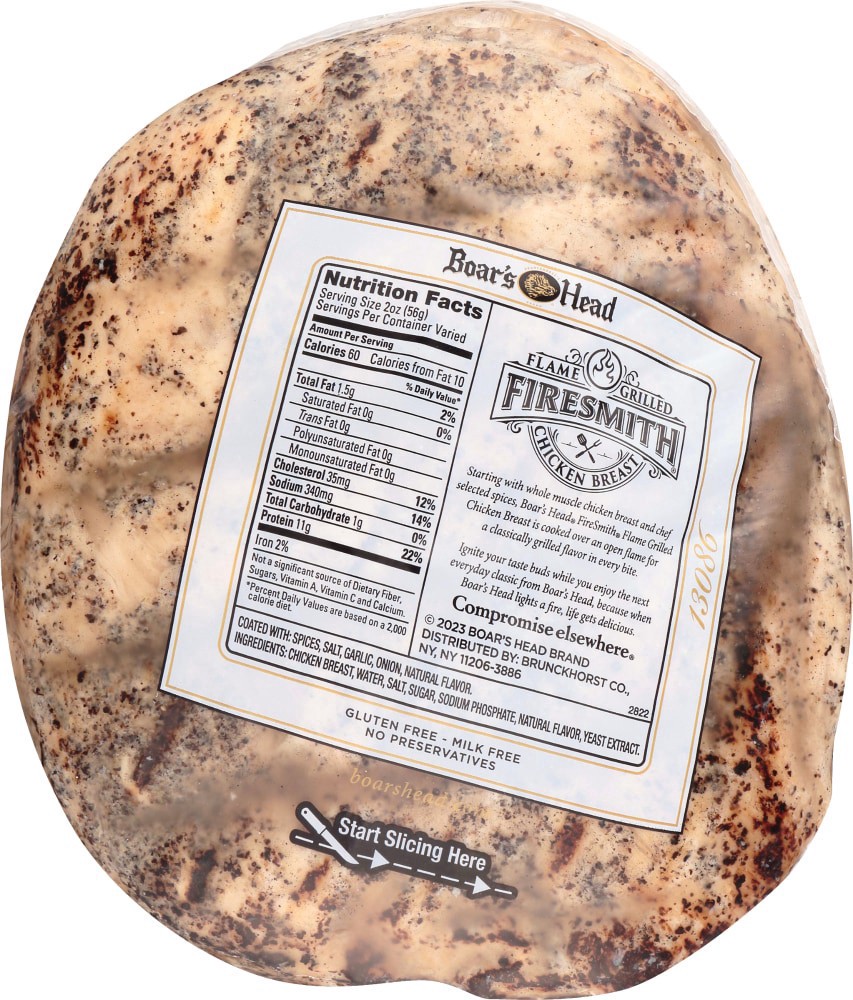 Made with whole muscle chicken breast and chef-selected spices, then cooked over an open flame, Boar's Head® FireSmith® Flame Grilled Chicken Breast is carefully crafted to deliver a genuine grilled f…