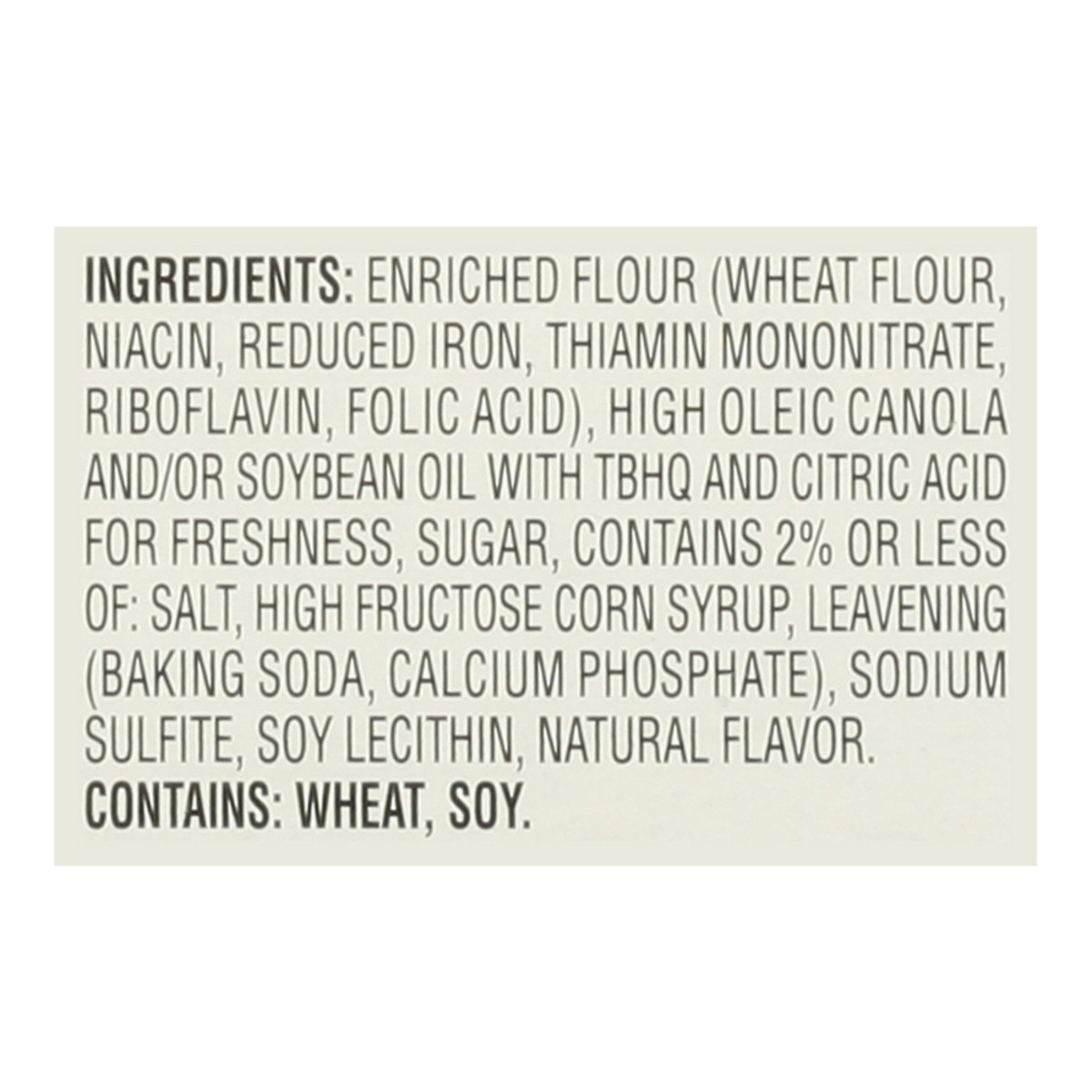 Enriched Flour (Wheat Flour, Niacin, Reduced Iron, Thiamine Mononitrate, Riboflavin, Folic Acid), High Oleic Canola and/or Soybean Oil with TBHQ and Citric Acid for Freshness, Sugar, Contains 2% or Le…