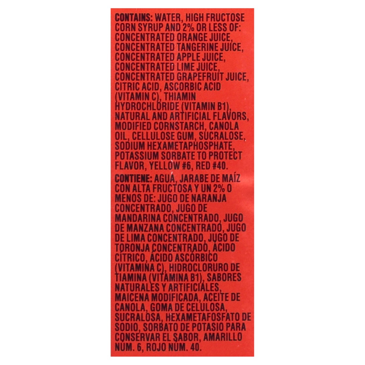 Water, High Fructose Corn Syrup and 2% or Less of: Concentrated Orange Juice, Concentrated Tangerine Juice, Concentrated Tangerine Juice, Concentrated Apple Juice, Concentrated Lime Juice, Concentrate…
