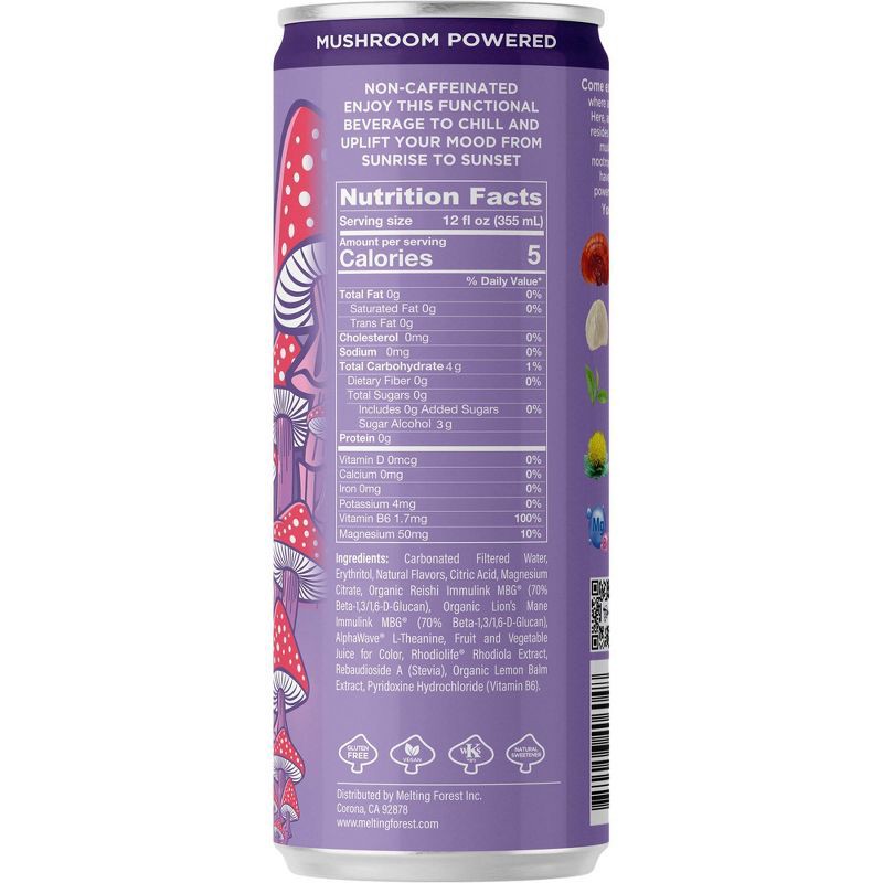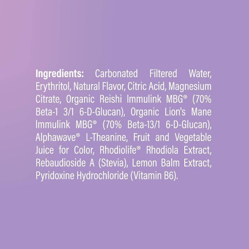 Carbonated Filtered Water, Erythritol, Natural Flavors, Citric Acid, Fruit and Vegetable Juice for Color, Malic Acid, Magnesium Citrate, Organic Reishi Immulink MBG (70% Beta-1,3/1,6-D-Glucan), Organi…
