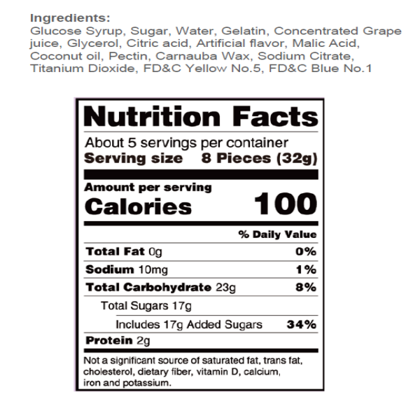 GLUCOSE SYRUP (FROM CORN), SUGAR, WATER, GELATIN, CONCENTRATED PINEAPPLE JUICE, GLYCEROL, CITRIC ACID, ARTIFICIAL FLAVOR, MALIC ACID, PECTIN, REFINED COCONUT OIL, CARNAUBA WAX, SODIUM CITRATE, TITANIU…