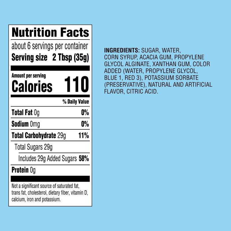 SUGAR, WATER, CORN SYRUP, ACACIA GUM, PROPYLENE GLYCOL ALGINATE, XANTHAN GUM, NATURAL AND ARTIFICIAL FLAVOR, POTASSIUM SORBATE (PRESERVATIVE), CITRIC ACID, BLUE 1.