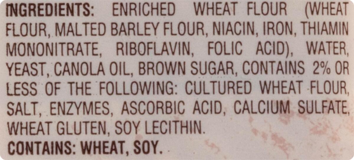Enriched Wheat Flour (Wheat Flour, Malted Barley Flour, Niacin, Iron, Thiamin Mononitrate, Riboflavin, Folic Acid), Water, Yeast, Brown Sugar, Contains 2% or less of: Canola Oil, Cultured Wheat Flour,…