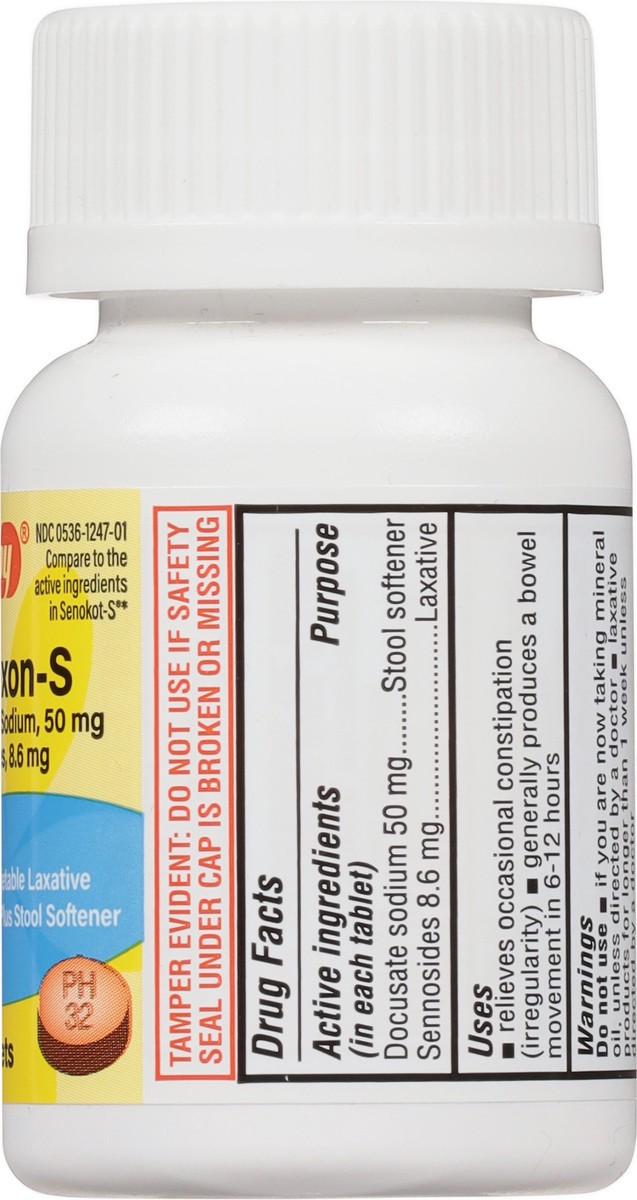 In Each Tablet: Active Ingredients: Docusate Sodium (50 mg), Stool Softener; Sennosides (8.6 mg), Laxative. Inactive Ingredients: Croscarmellose Sodium, D&C Yellow 10, Dicalcium Phosphate, FD&C Yellow…