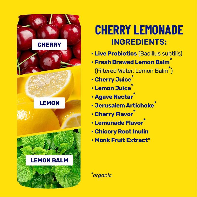 ingredients: fresh brewed lemon balm* (filtered water, lemon balm*), cherry juice*, lemon juice*, agave nectar*. jerusalem artichoke*, cherry flavor*, lemonade flavor*, chicory root inulin, monk fruit…