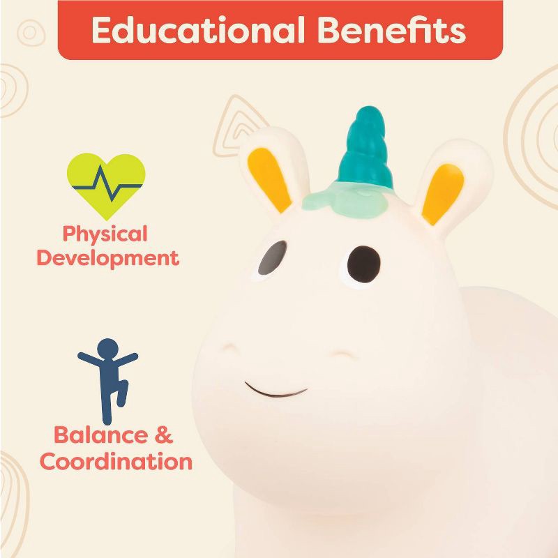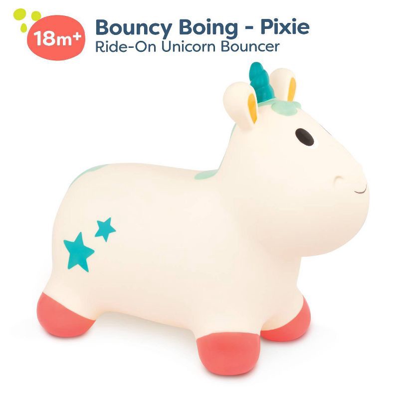 Hop on Pixie the magical unicorn, then grab the ears or horn to start bouncing around! This inflatable ride-on hopper from B. toys is super soft and is the perfect size for toddlers to ride. The easy-…