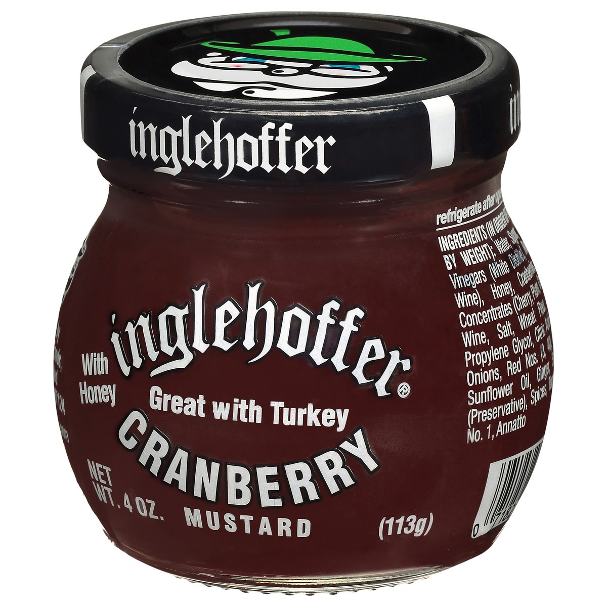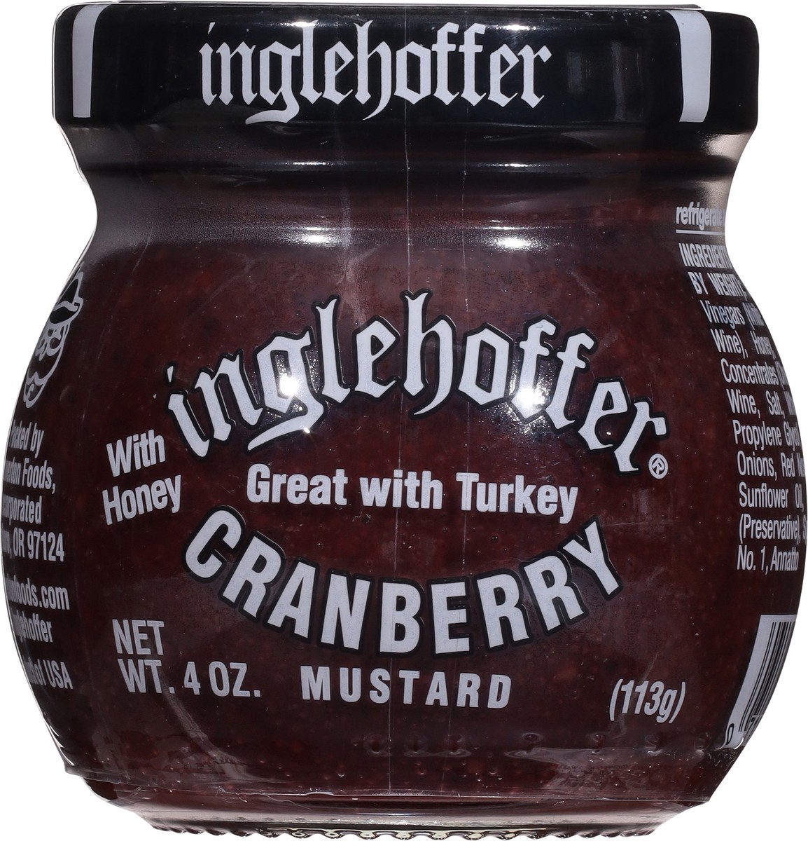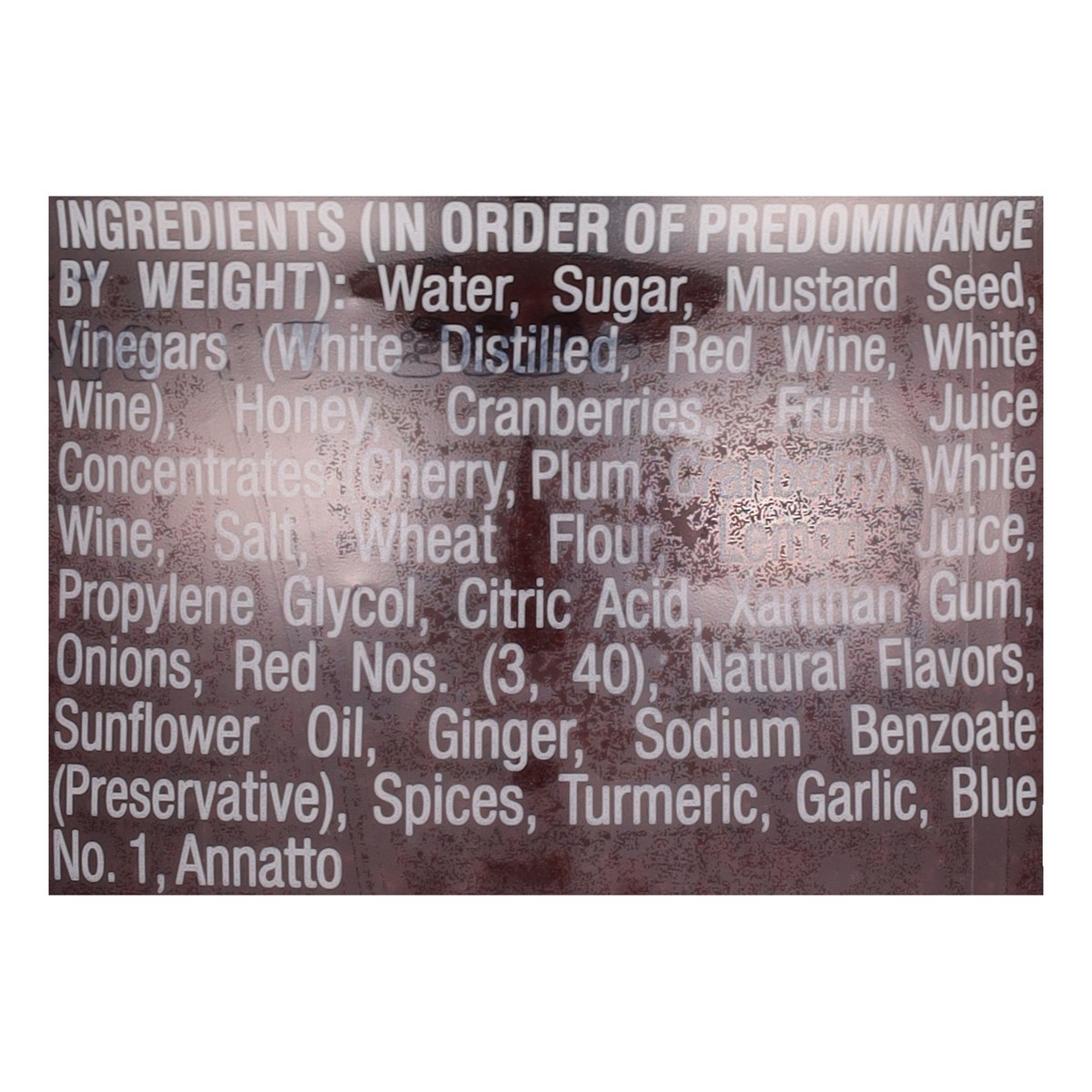 Water, Sugar, Mustard Seed, Vinegars (White Distilled, Red Wine, White Wine), Honey, Cranberries, Fruit Juice Concentrates (Cherry, Plum and Cranberry), White Wine, Salt, Wheat Flour, High Fructose Co…
