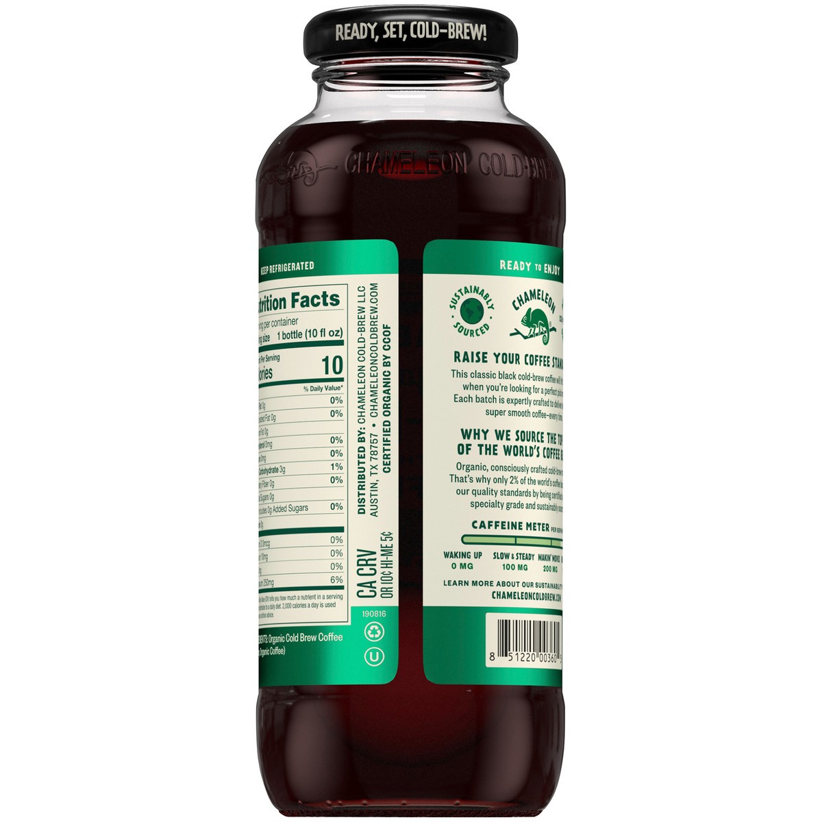 Caffeine Meter Per Serving: Makin' moves 200 mg. USDA Organic. Certified Organic by CCOF. Specialty Grade coffee beans. Ready, set, cold-brew! Ready to enjoy. Chameleon. Austin's cold brew original. R…