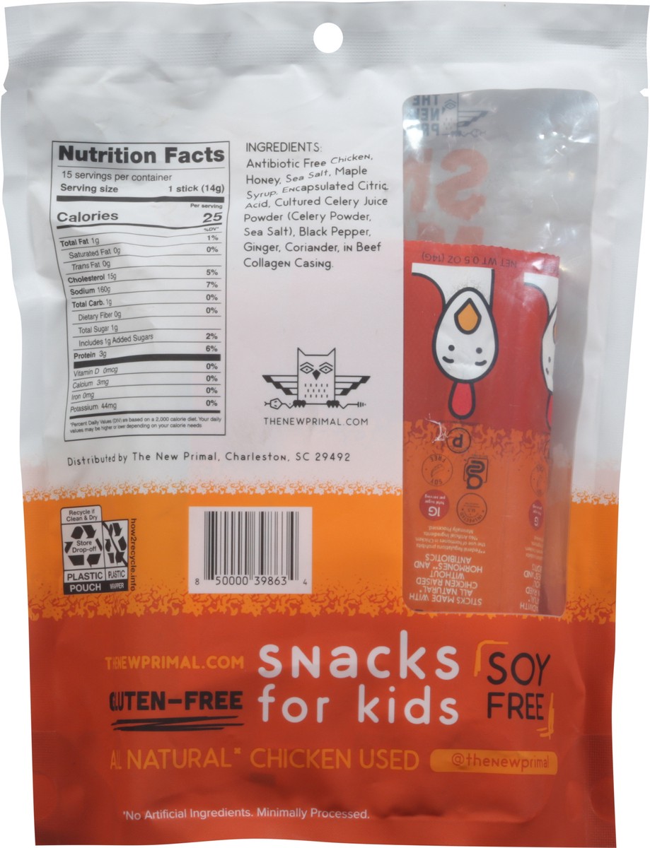 Antibiotic Free Chicken, Honey, Sea Salt, Maple Syrup, Encapsulated Citric Acid, Cultured Celery Juice Powder (Celery Powder, Sea Salt), Black Pepper, Ginger, Coriander, in Beef Collagen Casing.