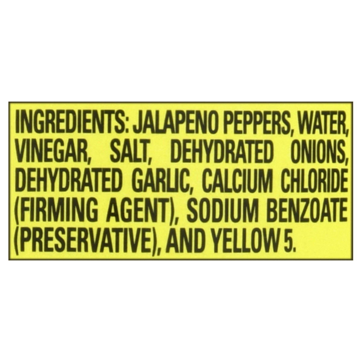 Jalapeno Peppers, Water, Vinegar, Salt, Dehydrated Onions, Dehydrated Garlic, Calcium Chloride (Firming Agent), Sodium Benzoate (Preservative), and Yellow 5.