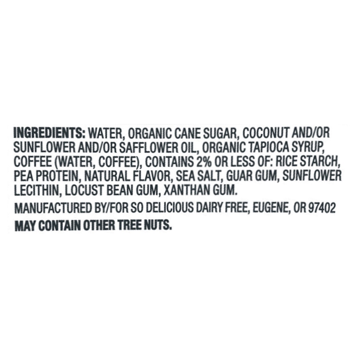 WATER, ORGANIC CANE SUGAR, COCONUT AND/OR SUNFLOWER AND/OR SAFFLOWER OIL, ORGANIC TAPIOCA SYRUP, COFFEE (WATER, COFFEE), CONTAINS 2% OR LESS OF: RICE STARCH, PEA PROTEIN, NATURAL FLAVOR, SEA SALT, GUA…