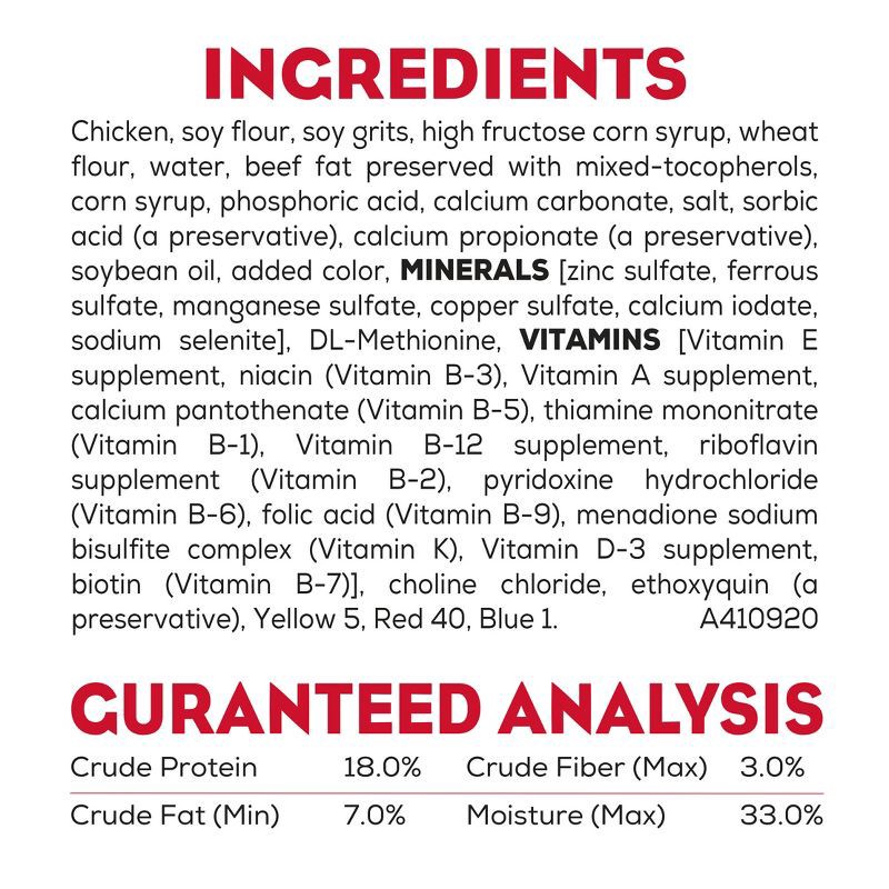 Chicken, Soy Flour, Soy Grits, High Fructose Corn Syrup, Wheat Flour, Water, Animal Fat Preserved with Mixed-Tocopherols, Corn Syrup, Phosphoric Acid, Calcium Carbonate, Salt, Sorbic Acid (a Preservat…
