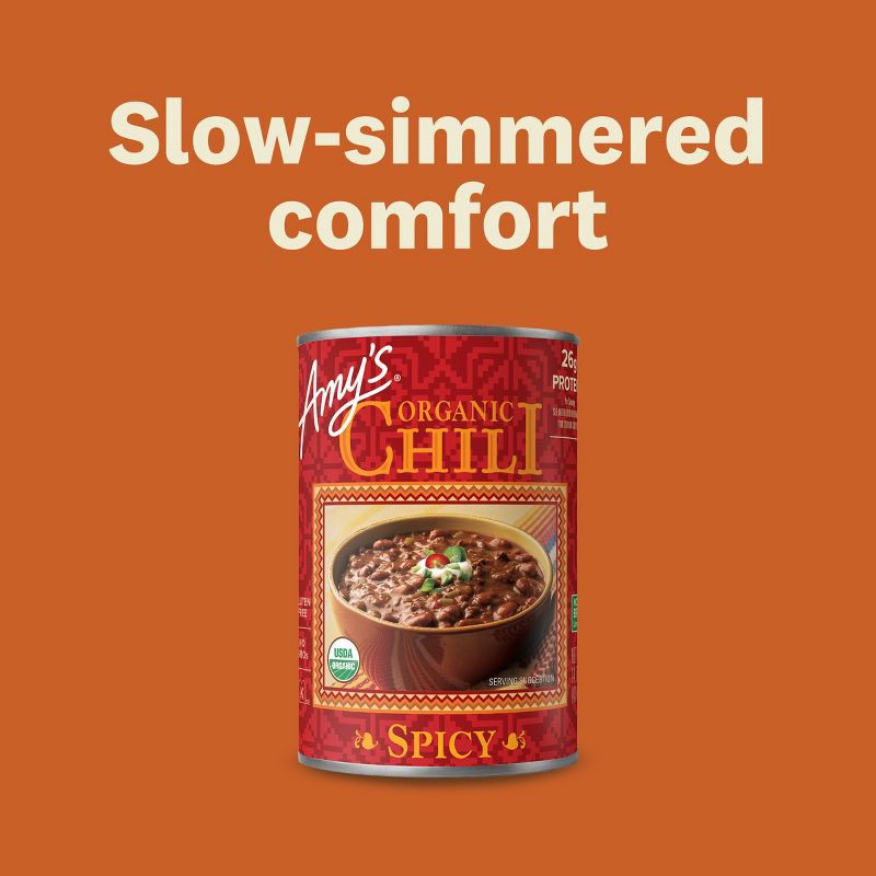 Amy's Organic Spicy Chili is made from organic red beans and tofu mixed with bits of bell pepper, garlic and jalapeño in a kicked-up Mexican-style broth. Amy's organic chili is a plant-based chili tha…
