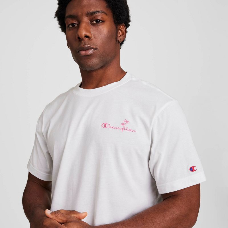 - Champion palm script embroidery at left chest