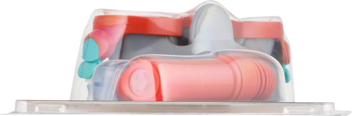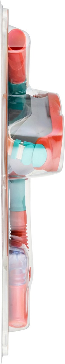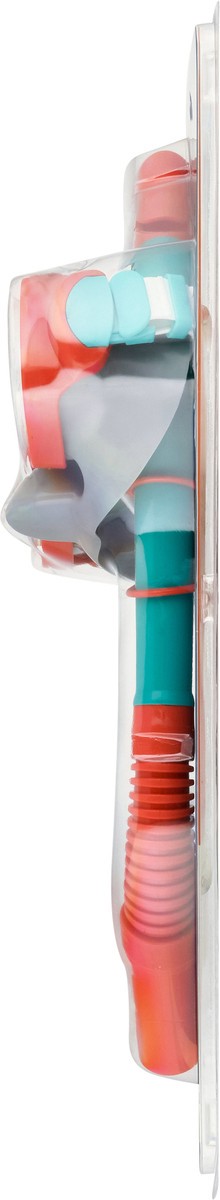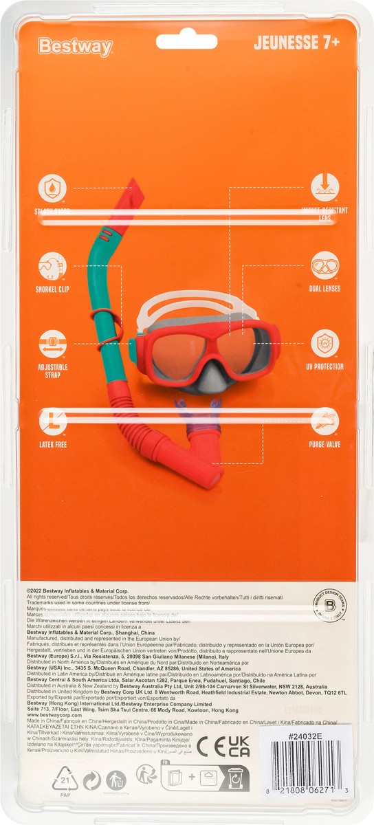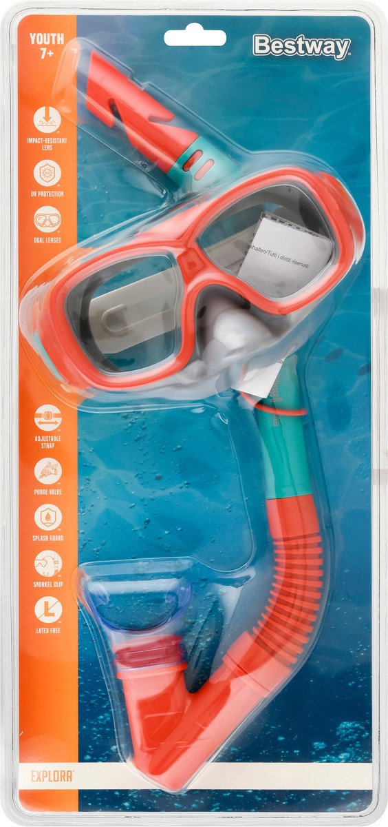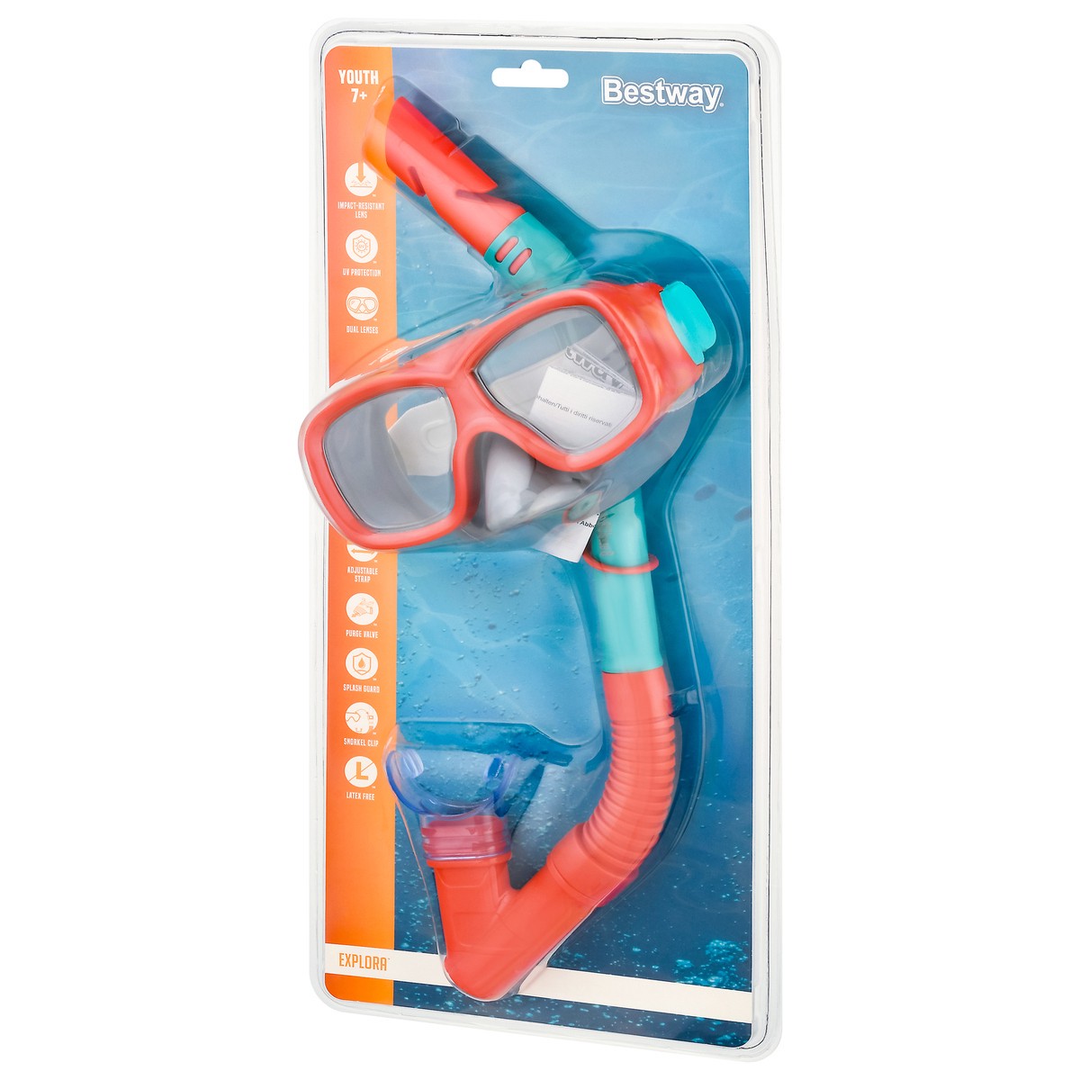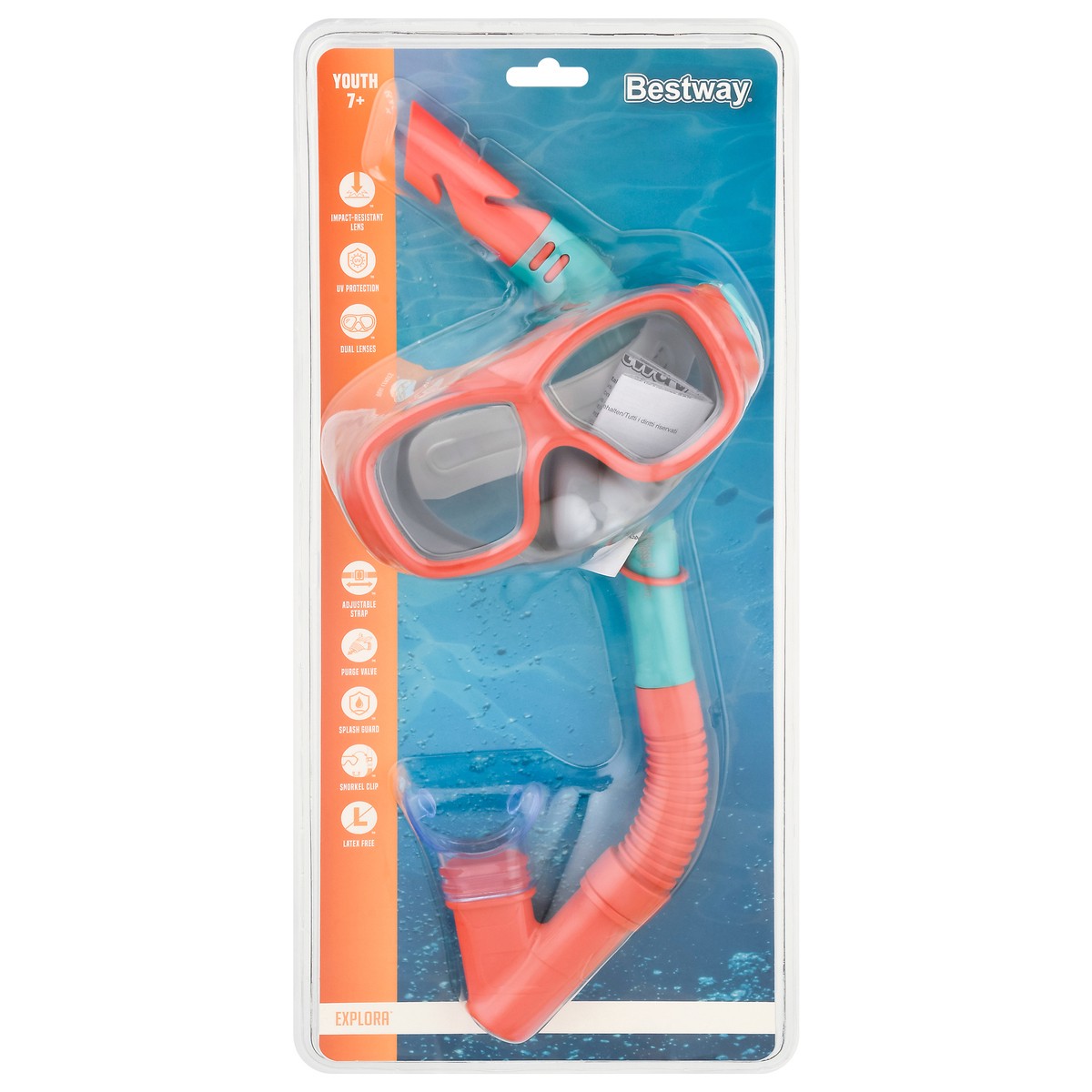 Impact-resistant lens. UV protection. Dual lenses. Adjustable strap. Purge value. Splash guard. Snorkel clip. Latex free. Dispose of properly.