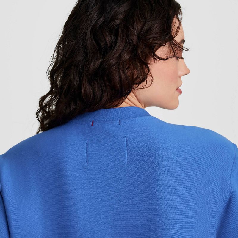 - Ribbed cuffs, side panels, hem, and V-notch, and crew neckline