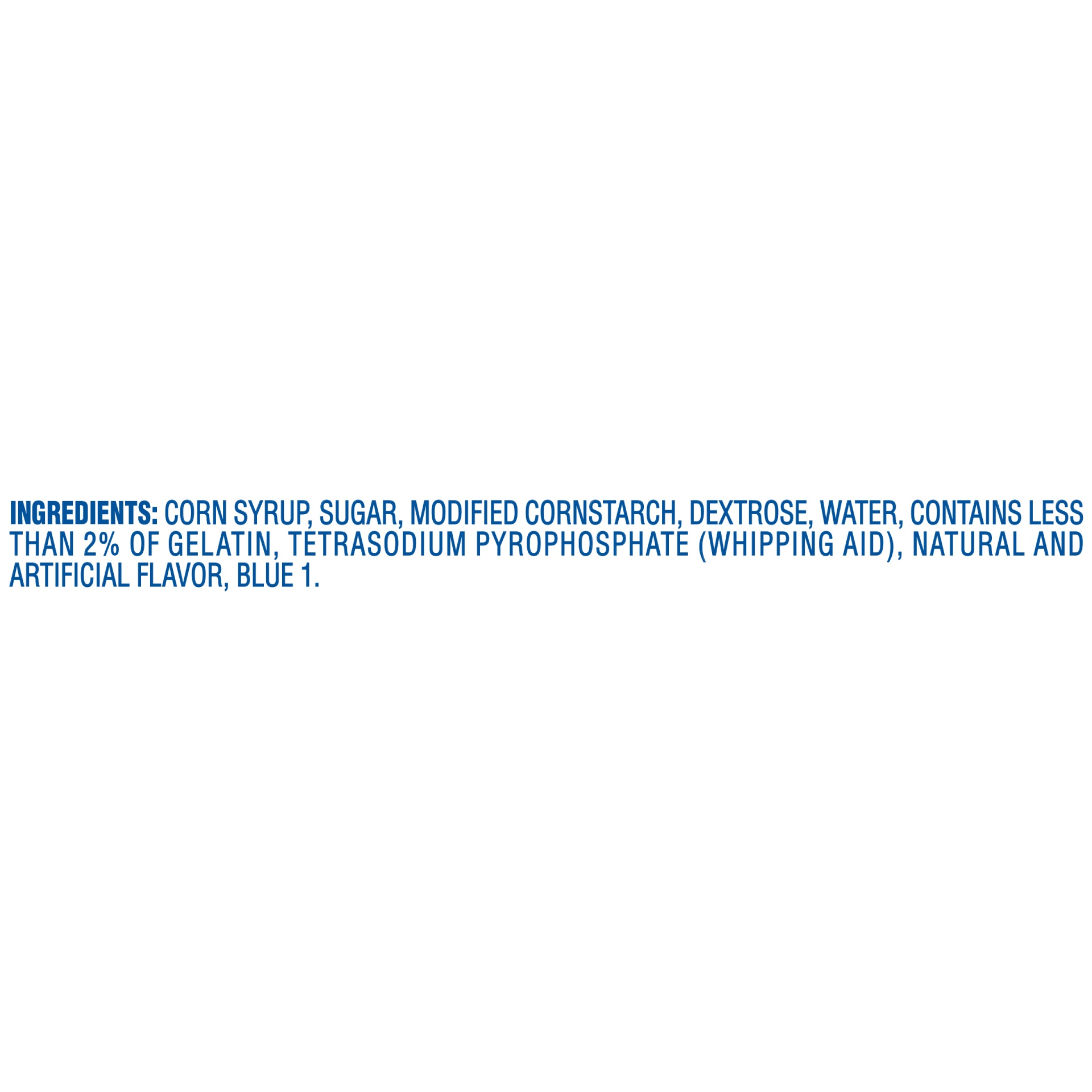 Corn Syrup, Sugar, Modified Cornstarch, Dextrose, Water, Contains Less than 2% of Gelatin, Tetrasodium Pyrophosphate (Whipping Aid), Natural and Artificial Flavor, Blue 1.