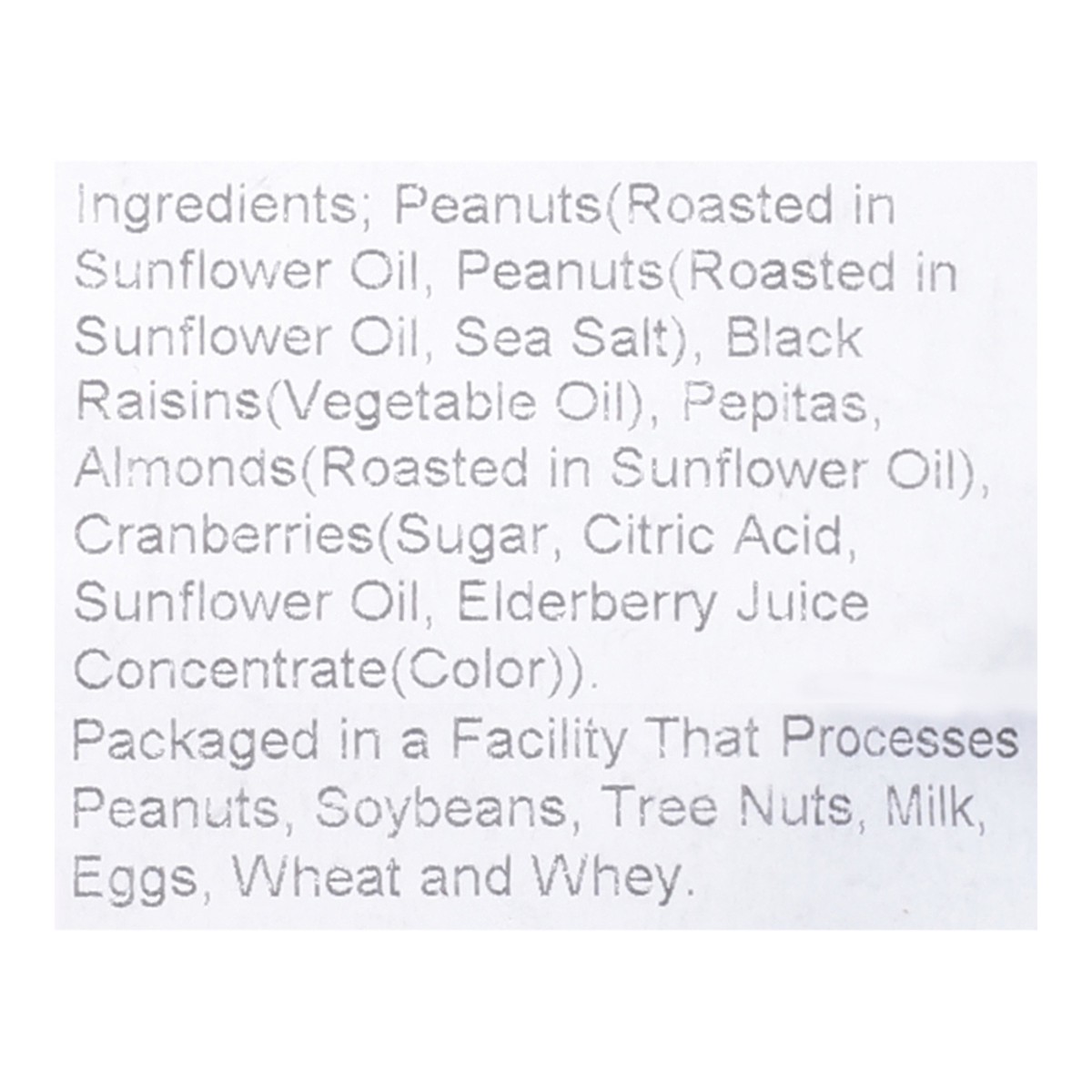 Peanuts (Roasted in Sunflower Oil, Peanuts (Roasted in Sunflower Oil, Sea Salt), Black Raisins (Vegetable Oil), Pepitas, Almonds (Roasted in Sunflower Oil), Cranberries (Sugar, Citric Acid, Sunflower …