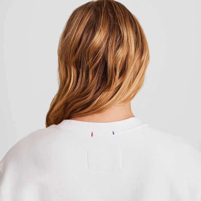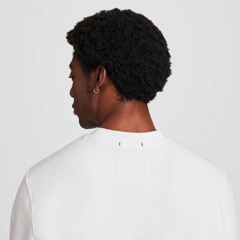- Ribbed cuffs, side panels, hem, and V-notch, and crew neckline