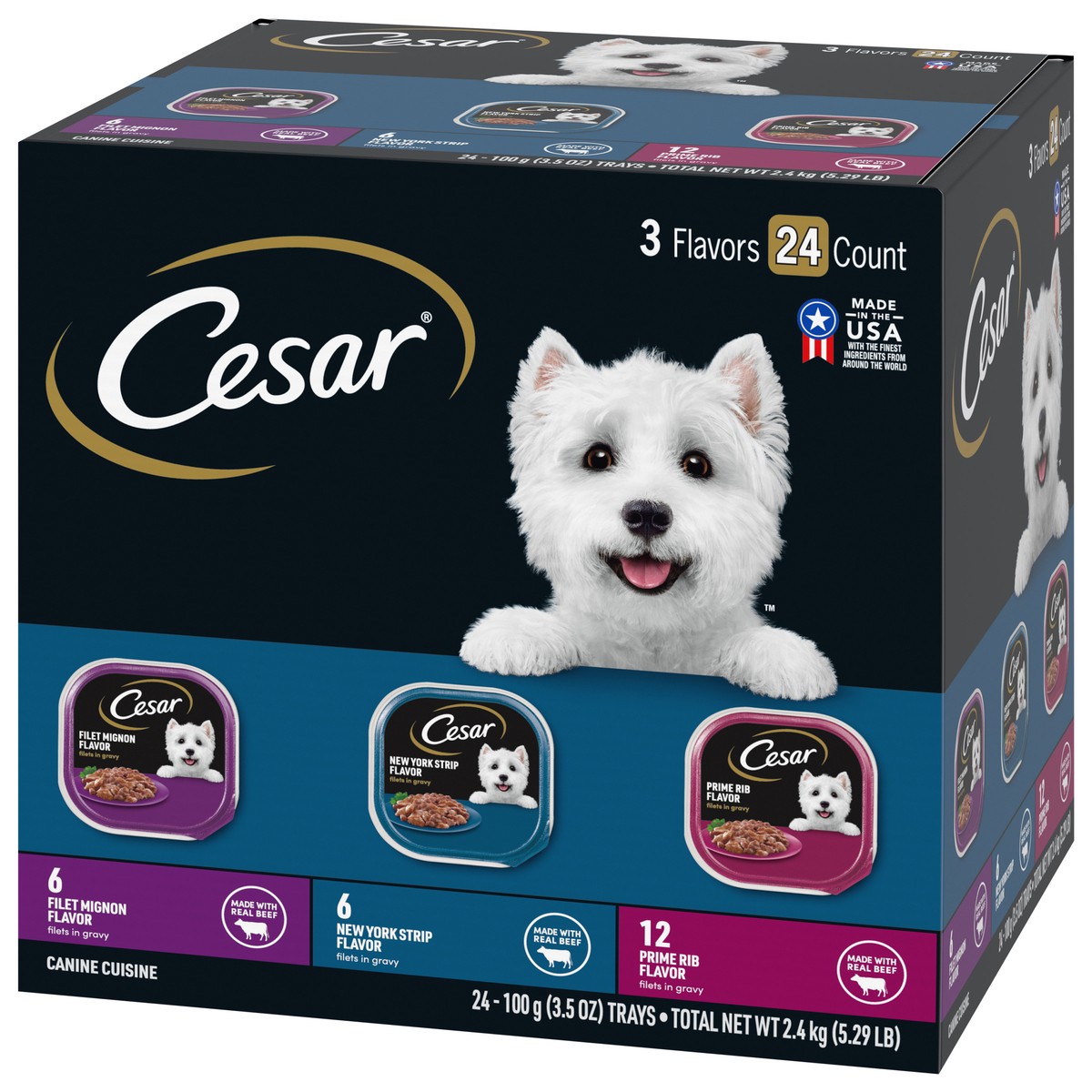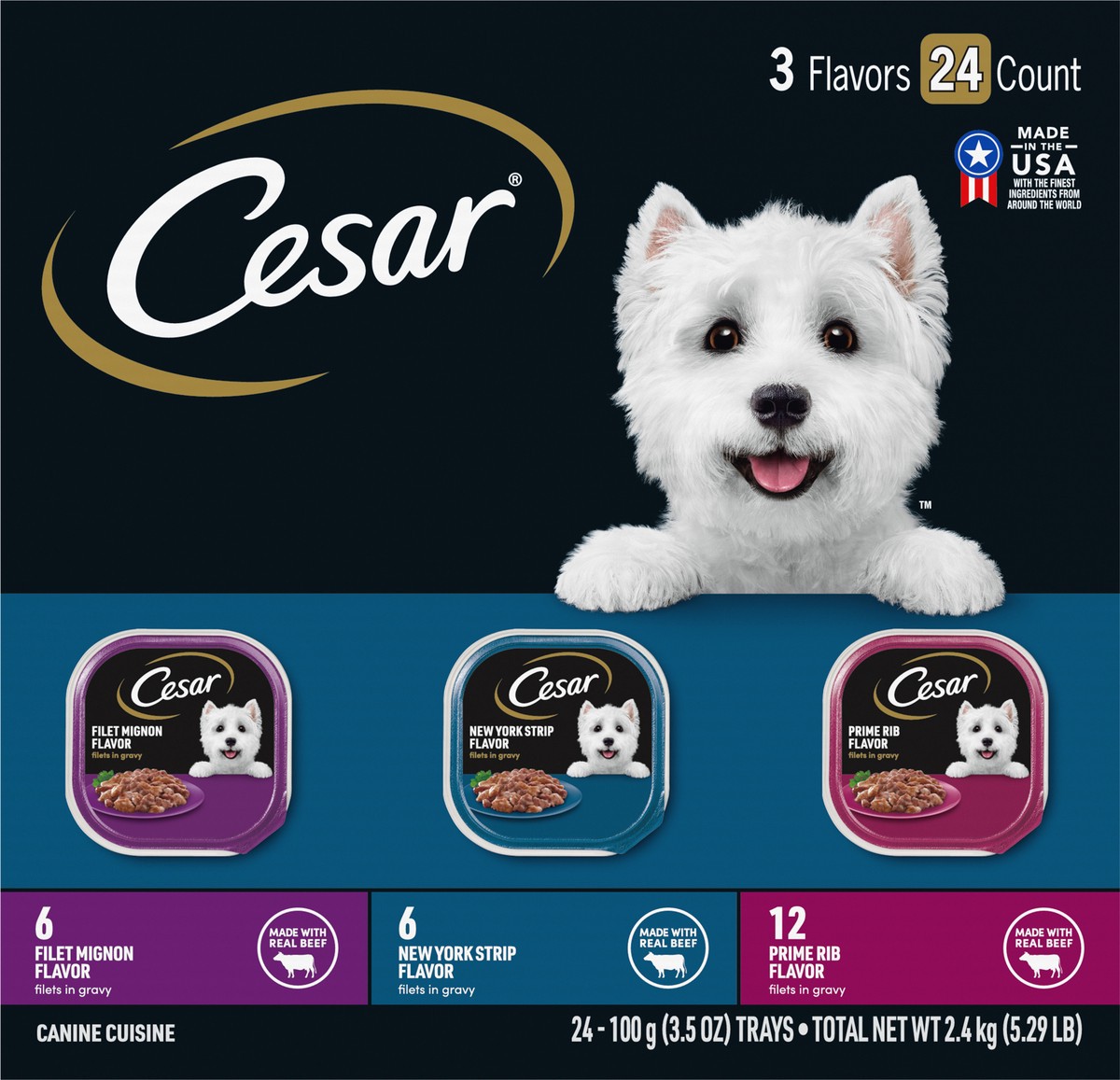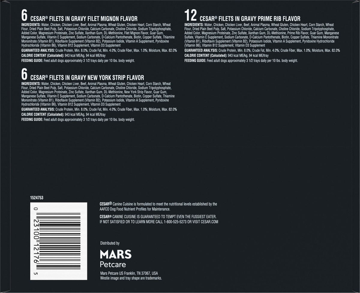 Cesar Filets in Gravy Filet Mignon Flavor: Water, Chicken, Chicken Liver, Beef, Animal Plasma, Wheat Gluten, Chicken Heart, Corn Starch, Wheat Flour, Dried Plain Beet Pulp, Salt, Potassium Chloride, C…