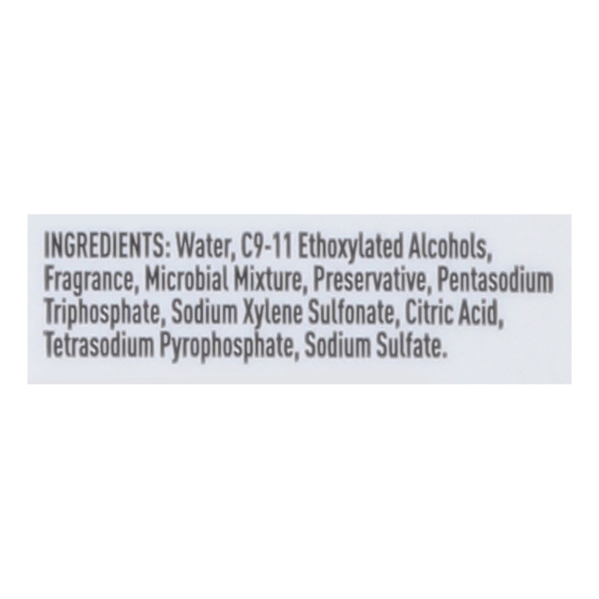 Water, C9-11 Ethoxylated Alcohols, Fragrance, Microbial Mixture, Preservative, Pentasodium Triphosphate, Sodium Xylene Sulfonate, Citric Acid, Tetrasodium Pyrophosphate, Sodium Sulfate.